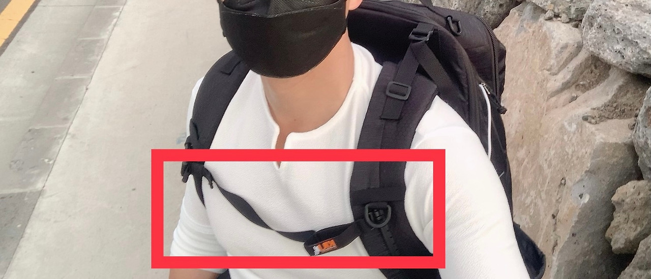이때, 가슴끈을 조이면, 어깨가 상당히 편해지고 배낭이 흔들리는 것을 막아주어 어깨가 훨씬 덜 아프게 됩니다.