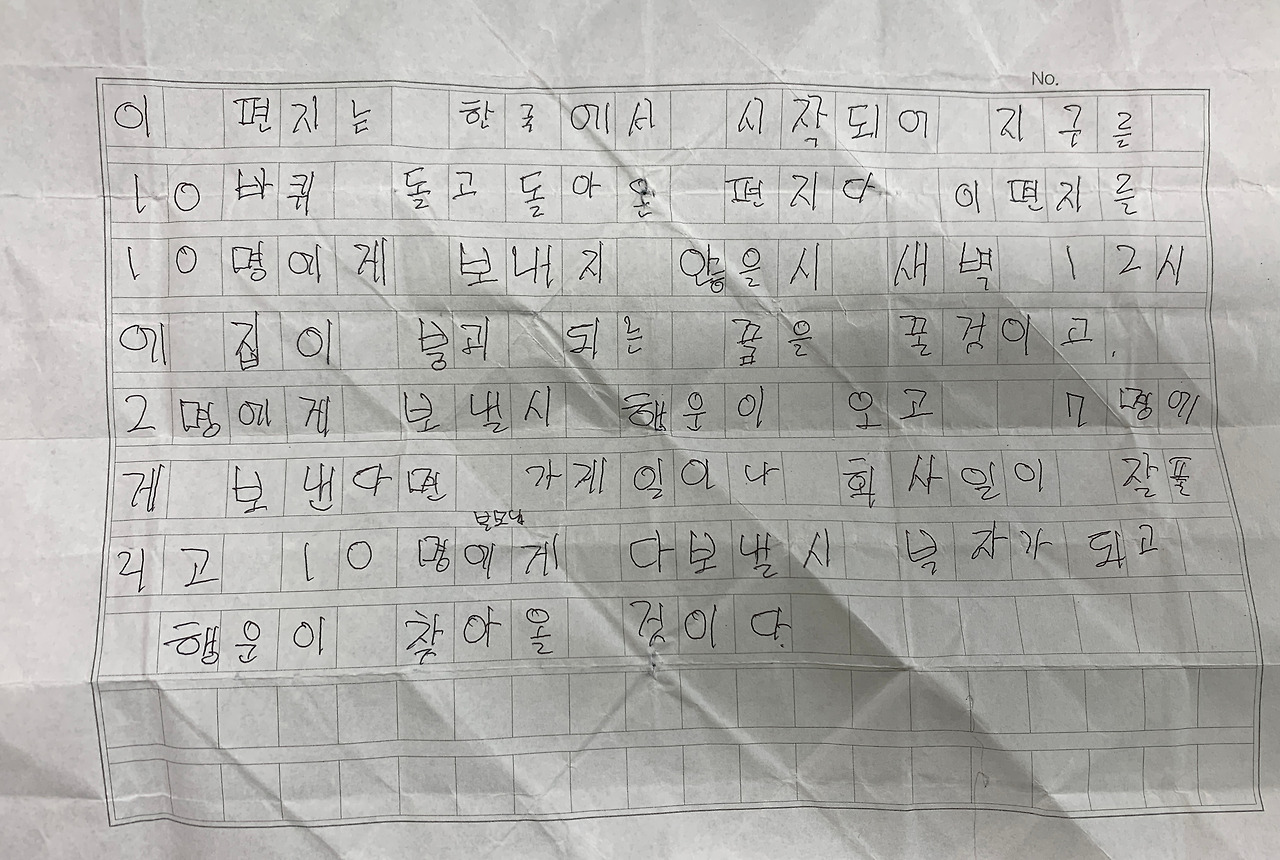 당시 그 긴 편지 내용을 10번이나 쓰는 것이 귀찮아 쿨하게 무시했지만, 간혹 마음이 찜찜하였고 혹여나 그날 나쁜 일이 생기면 행운의 편지의 저주와 연결하곤 했습니다.