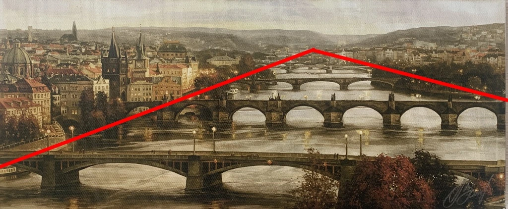 오늘따라 그 그림이 눈에 들어오더니 지속적으로 저의 눈길을 사로 잡았습니다. 그림은 멋진 풍경과 더불어 소실점이 명확하여 깊은 원근감을 잘 표현한 작품이었지요. 소실점이란 원근감을 표현하기 위해 가상의 점에서 직선으로 그은 것으로 2차원 평면의 작품을 3차원의 입체감을 부여하는 역할을 하지요.