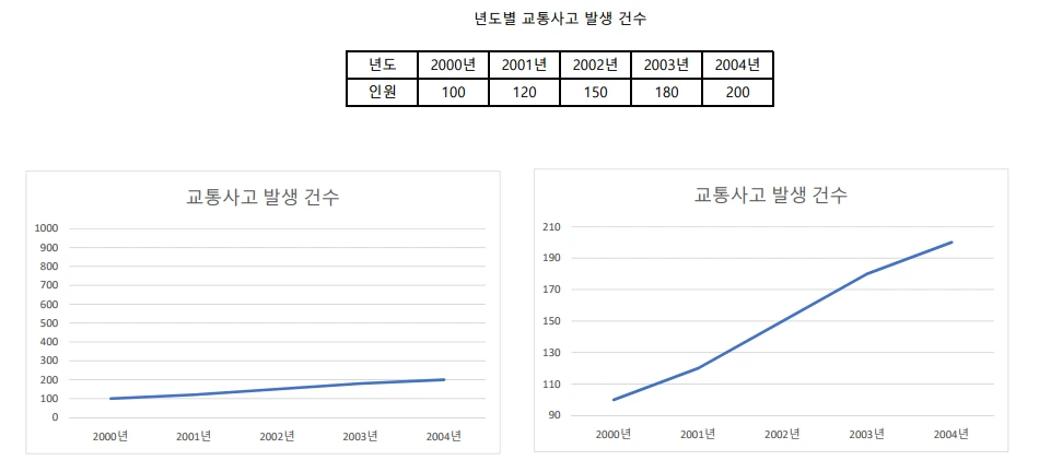 동일한 데이터라고 하여도 마치 오른쪽 그래프가 급하고 심각하게 느껴지지요.