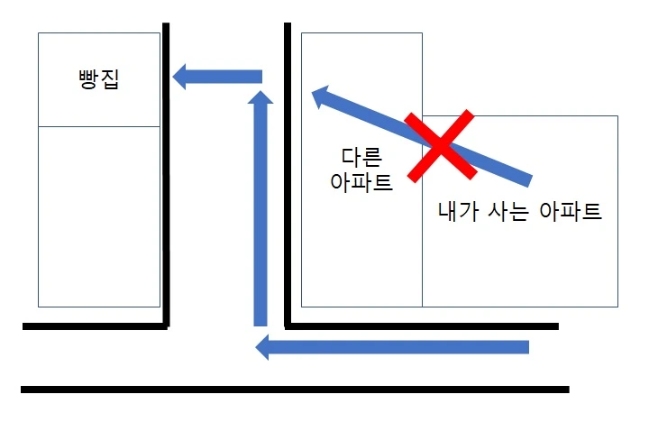 주말에 빵을 사기 위해 옆 단지 아파트 입구를 자주 지납니다. 그럴 때마다 만약 옆단지와 내가 살고 있는 아파트가 길로 연결되어 있다면, 굳이 빙 돌아서 가지 않고 직선거리로 빵가게와 상당히 가까워지지요.