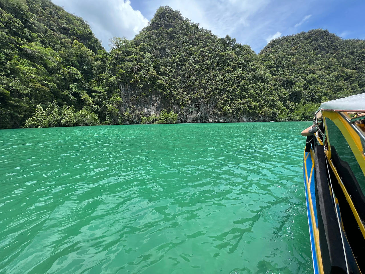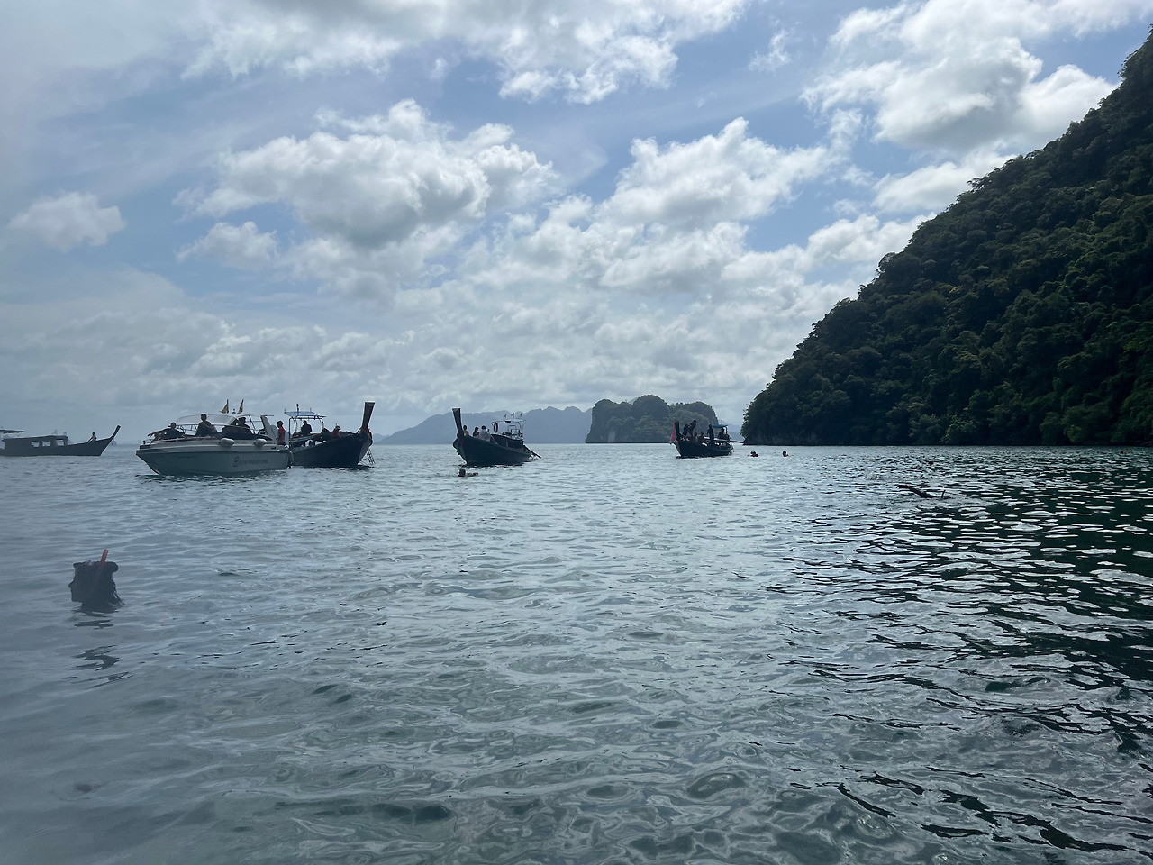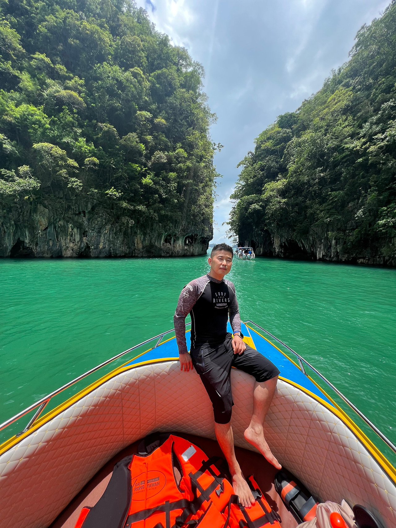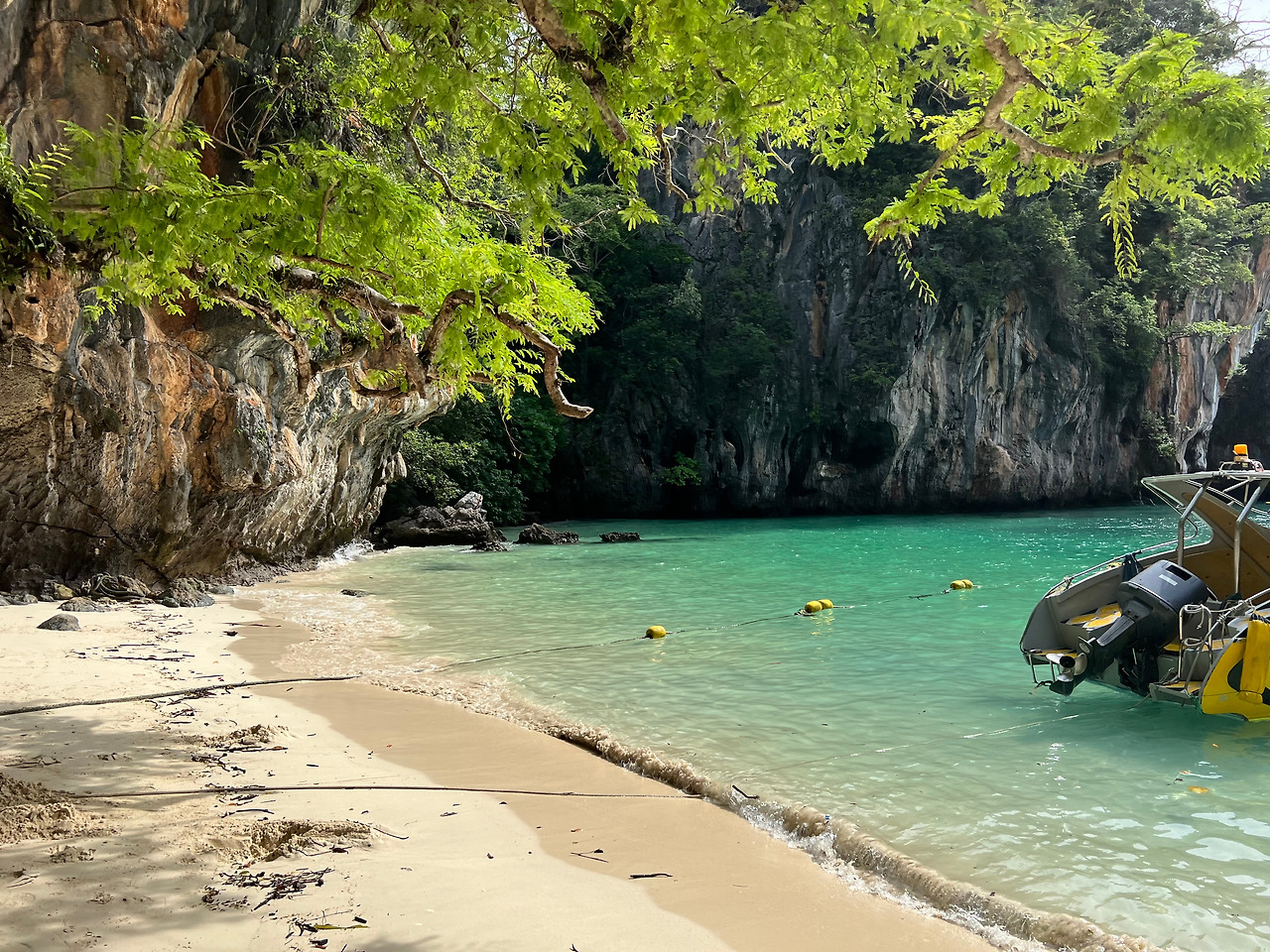다음으로 홍섬라군(Lagoon of koh hong island)으로 배에서 진한 녹색의 바다를 볼 수 있다. 작은 배위에서 사진을 찍는 사람들을 뚫고 열심히 사진을 찍고 싶었지만 폰을 떨어뜨리면 끝이라는 생각에 소심하게, 정말 조심스럽게 풍경을 담았다. 가이드가 1명씩 뱃머리 앞에서 사진을 찍어주는데, 무슨 기술로 찍었는지, 168센치의 나를 175센치의 키로 쭉 늘려 찍어주었다. 아마 일을 하는 동안 수많은 사진을 찍어주면서 자신만의 촬영기술을 익혔으리라.. (땡큐~~)