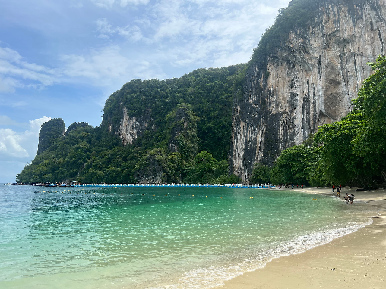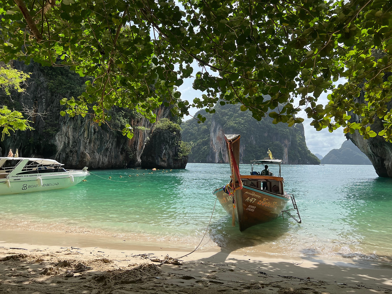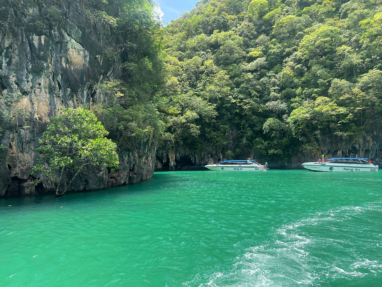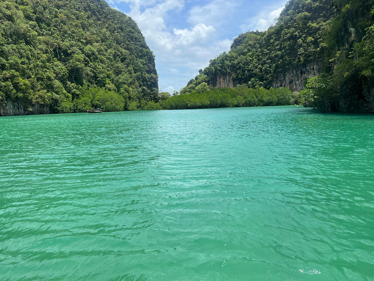 다음으로 홍섬라군(Lagoon of koh hong island)으로 배에서 진한 녹색의 바다를 볼 수 있다. 작은 배위에서 사진을 찍는 사람들을 뚫고 열심히 사진을 찍고 싶었지만 폰을 떨어뜨리면 끝이라는 생각에 소심하게, 정말 조심스럽게 풍경을 담았다. 가이드가 1명씩 뱃머리 앞에서 사진을 찍어주는데, 무슨 기술로 찍었는지, 168센치의 나를 175센치의 키로 쭉 늘려 찍어주었다. 아마 일을 하는 동안 수많은 사진을 찍어주면서 자신만의 촬영기술을 익혔으리라.. (땡큐~~)