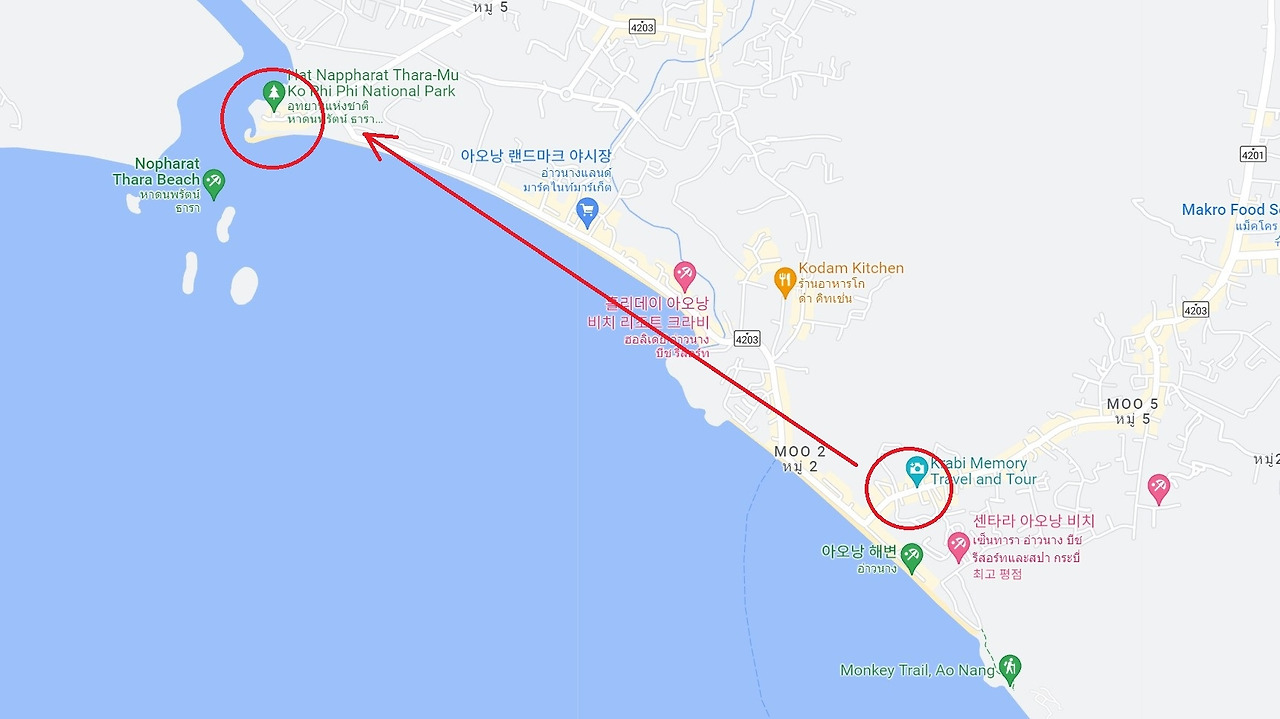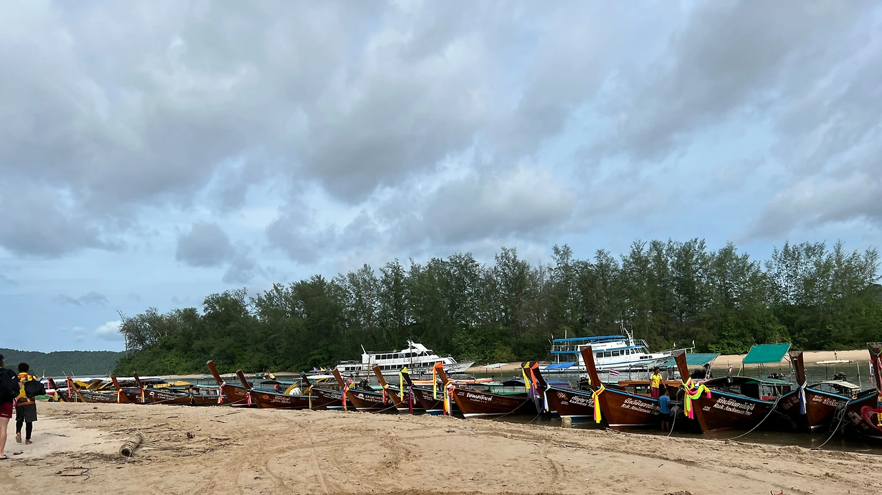 생태우를 타고 아오낭 해변 북쪽 'Noppharat Thara Beach'로 향한다. 나중에 보니, 섬투어는 다 여기서 출발하는듯 하다. 가이드의 인원 체크 후, 해변가 선착장으로 향한다. 일반적인 선착장이 아니라 해변가 모래사장에 배를 정착한 형태라 배에 오를때, 신발을 벗는다.(이후 신발 신을 일이 없다.)