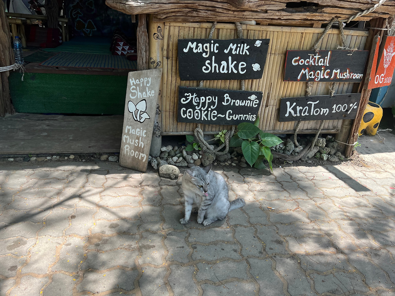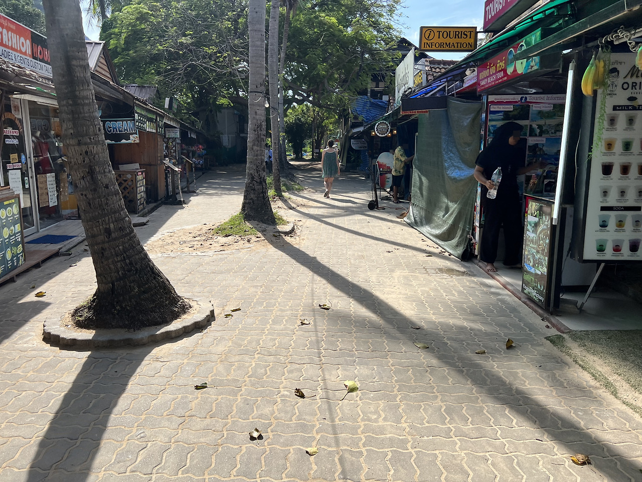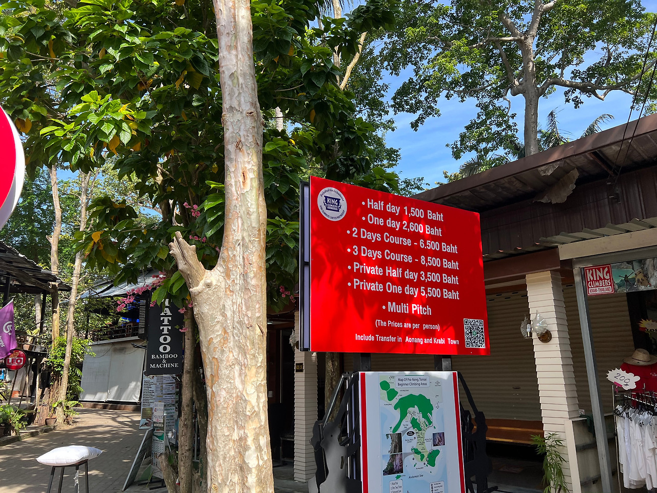 낭만적인 라일레이 해변을 눈을 실컷 담고 프라낭 해변으로 향한다. 가는 길에 조그마한 식당들과 바, 기념품 가게들이 보인다. 화장실도 보이는데, 돈을 내고 사용해야 한다. 듬성듬성 암벽등반을 예약할 수 있는 가게들도 보인다.
