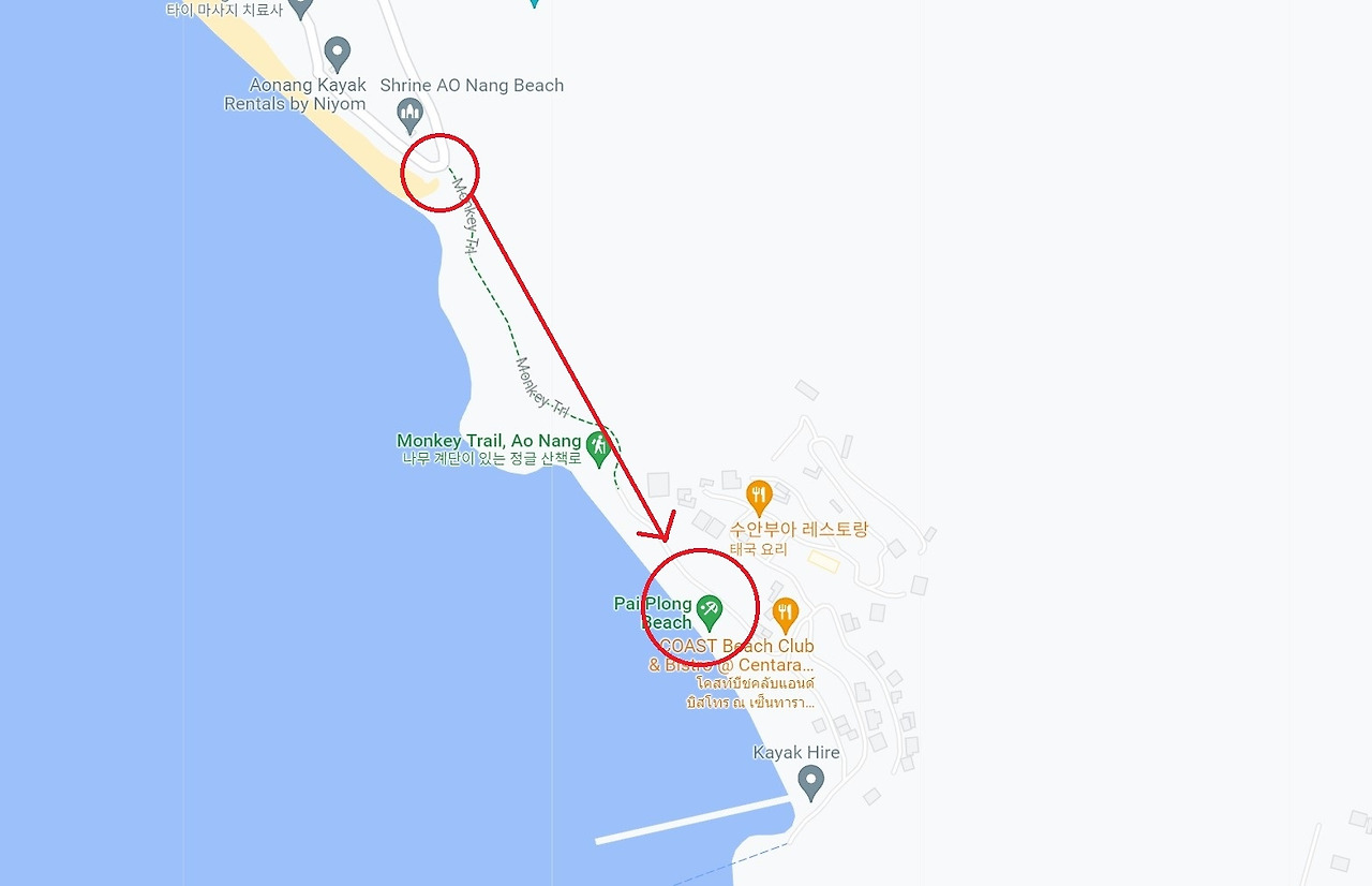경사가 제법 있어 조금 힘들기는 해도 충분히 갈 수 있는 길이다. 한참을 올라가니, 아오낭 해변 전체가 보인다. 몽키트레일이라고 해서 도중에 원숭이라도 만날까 기대했지만 그저 새소리만 울려퍼질 뿐이었다. 어느덧 정상을 지나 고급 리조트가 즐비한 Pai Plong Beach에 도착하였다. 해변을 목적없이 걷다보니, 게 한마리가 보인다. 참 귀엽다. 정글속에 숨어 있는 듯한 리조트와 해변의 조화가 참 잘 어울렸다.