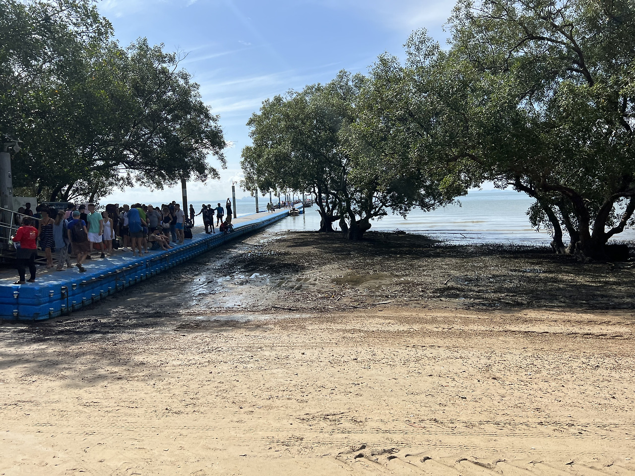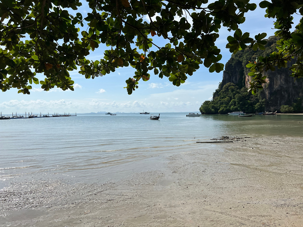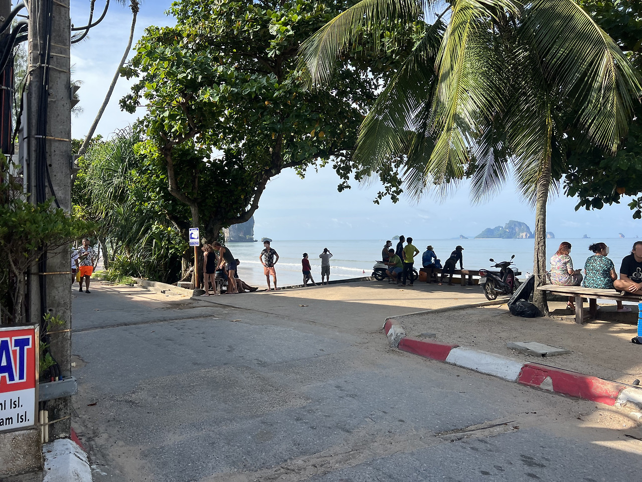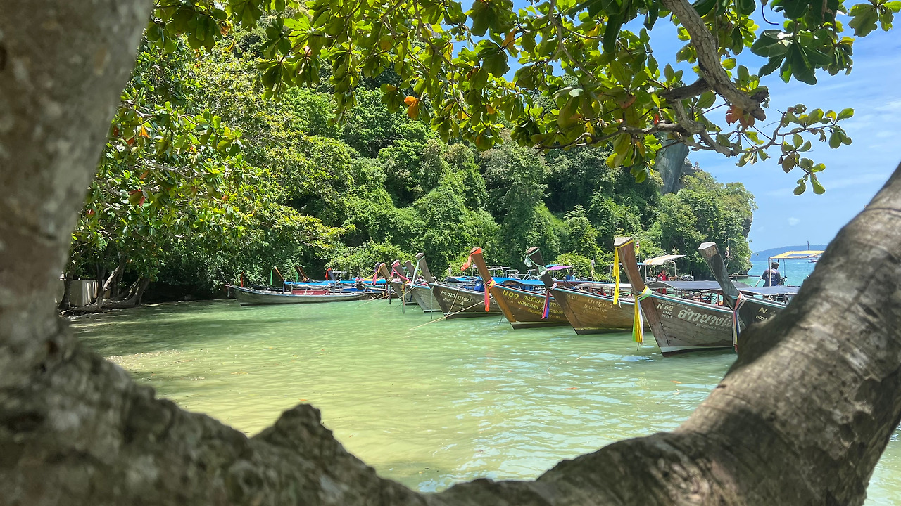 점심식사를 마치고 나니, 피곤이 밀려온다. 옷과 에코백은 진흙으로 엉망이고 약간 컨디션도 좋지 않아 주말동안 예약한 숙소로 돌아가고 싶었다. 레일레이 해변의 모래사장은 아침과 달리 바닷물에 잠겨있다. 해변끝에 아오낭으로 돌아갈 배들이 있는 선착장이 보인다.