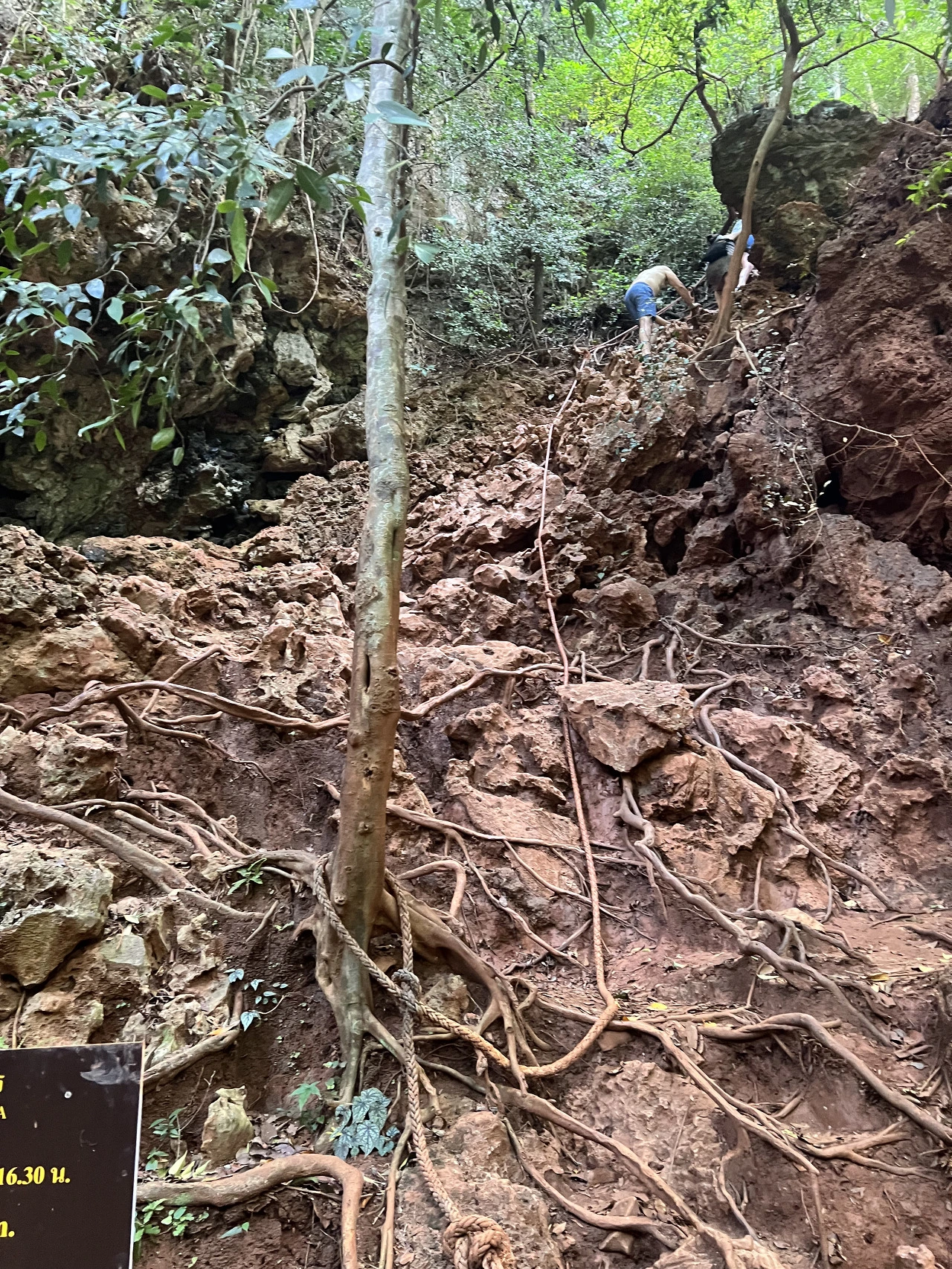 1시간 정도 수영을 하고 풍경도 감상하면서 시간을 보내는데, 어느 순간부터 사람들이 갑자기 많아졌고 처음 담았던 풍경이 사람들로 인해 변해가는 것이 느껴져 아오낭으로 돌아가기로 하였다. 짐을 챙겨 돌아오는 도중에 프라낭 라군으로 가는 절벽코스가 있었다. 갑자기 도전의식이 생긴다. 급한 경사로라 줄을 잡고 올라가야 되는데, 위험하게 느껴졌다. 하지만 암벽 등반도 못하고 돌아가는 아쉬움이 자꾸 나를 절벽에 오르고 싶게 만들었다. 몇번의 망설임 끝에 지금 아니면 못한다는 생각에 에코백 손잡이를 머리에 걸고 일단 올라간다.