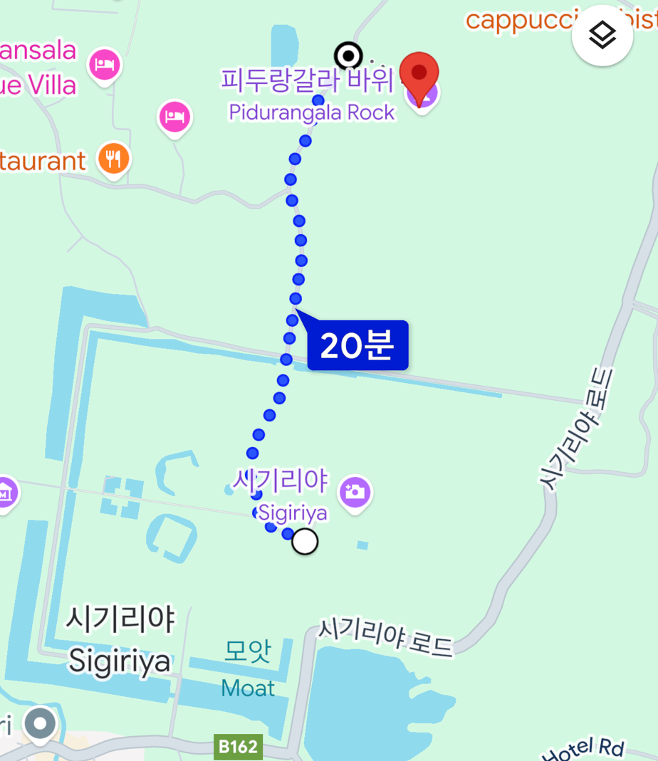 관람을 끝내고 피두랑갈라로 이동할 때는 걸어서 이동이 가능하다. 다만, 더운 날씨에 20분 넘게 걸어야 하기에 피두랑갈라에 도착하여 또 등산을 하려면 체력 배분이 필요하다. 시기리야를 오를때보다 더 가파르고 힘이 더 든다.