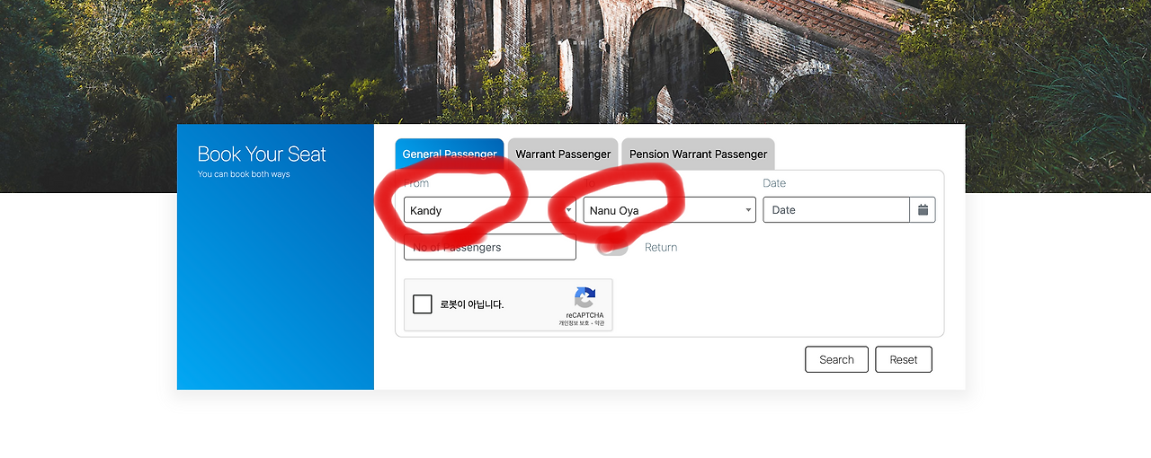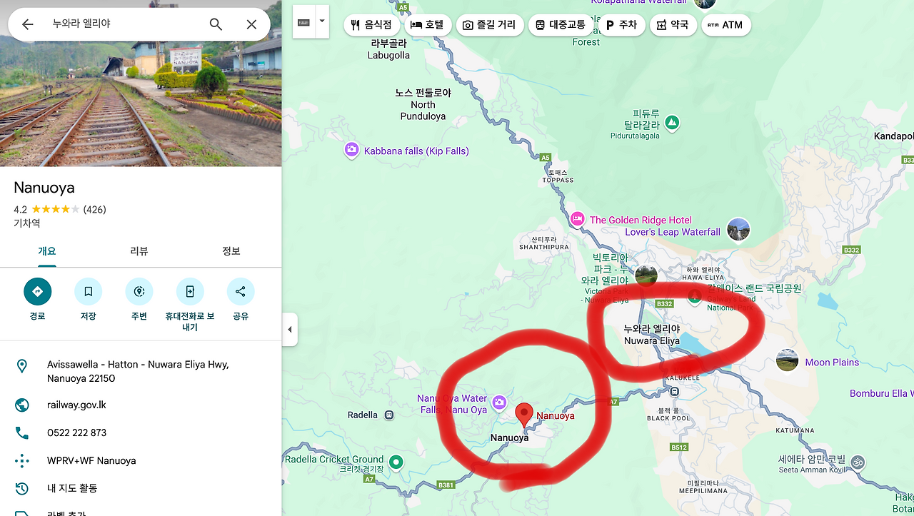 그런데 기차로 누와라엘리야로 가기 위해서는 도착역을 누와라엘리야가 아닌 나누오야(Nanu Oya)에서 내려서 툭툭을 타고 20분 정도 아동해야 힌다. 즉, 스리랑카 철도청 예약 사이트(https://seatreservation.railway.gov.lk/mtktwebslr/)에서 예약할 때도 나누오야(Nanu Oya)로 검색해야 한다.