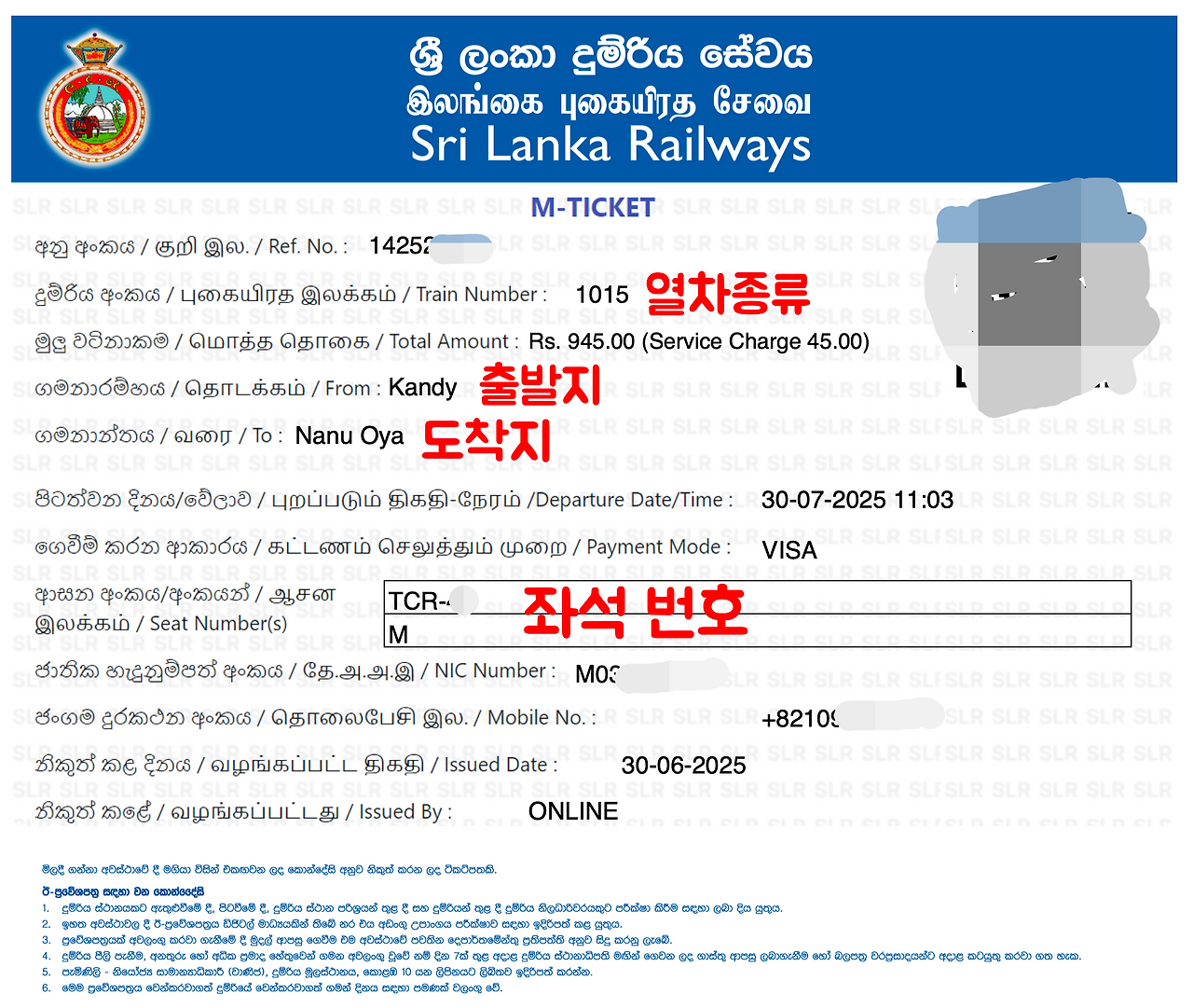 한달 전에 온라인으로 예약했는데, 잠깐 머뭇거리는 사이에 매진이 되어 어쩔 수 없이 누와라엘리야-나누오야, 나누오야-엘라 구간으로 2일에 걸쳐 이동하는 일정으로 예약을 하였다(스리랑카와 한국의 시차가 3시간 30분 차이이므로 우리나라 새벽 3시 30분즈음 딱 한달 후 해당 날짜의 예약이 열린다).