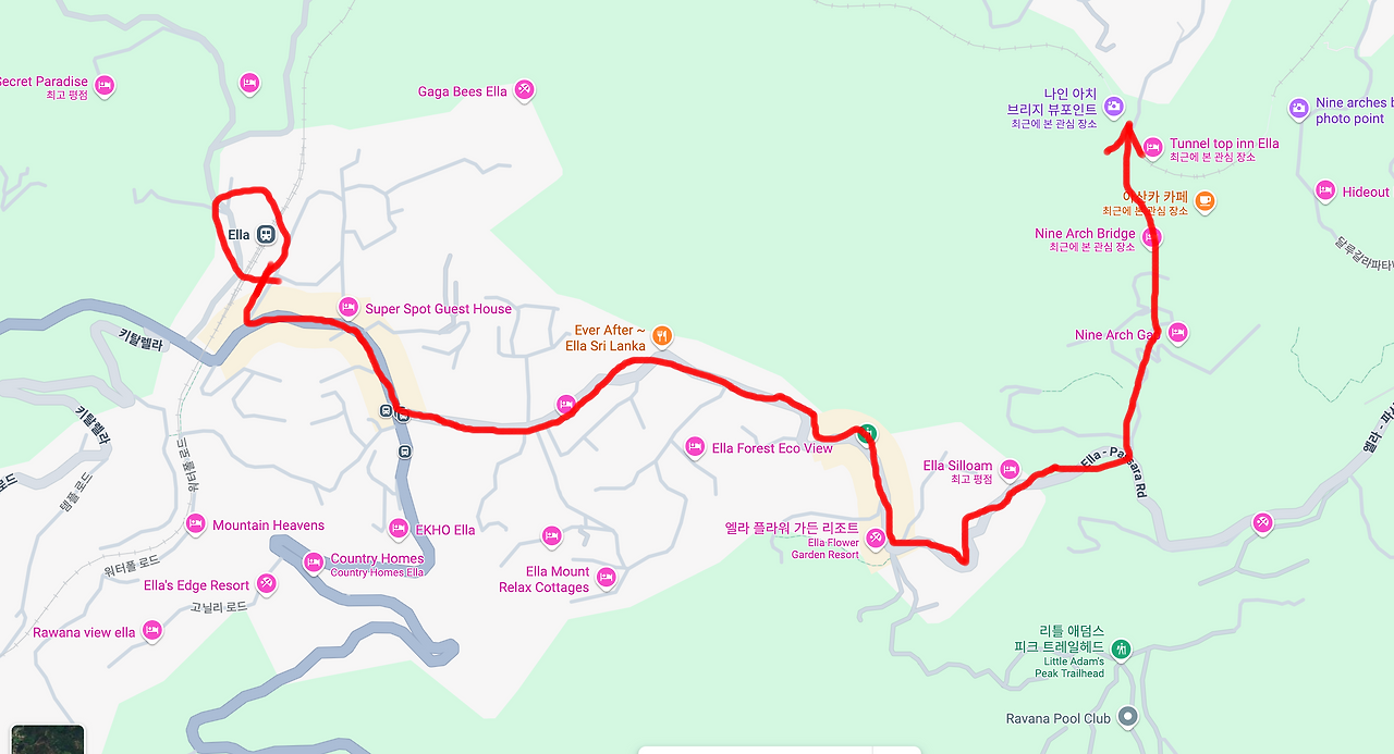 짐을 풀고 나인아치브릿지로 향했다. 처음에는 30분 정도 걸어서 가려고 했으나 체력적으로 힘들어 툭툭을 타기로 했다. 역시 비싸게 불러 픽미(Pickme)앱에서는 800루피 정도라고 하니 1000루피에 합의를 보았다. 사실 5~10분 이동하는 거리라 1000루피도 비싸다. 또한, 구글맵 이동경로는 북쪽으로 가는 방향을 알려주지만, 남쪽 방향으로 이동하는 것이 더 좋은 경치를 볼 수 있다(도보도 가능한 거리).