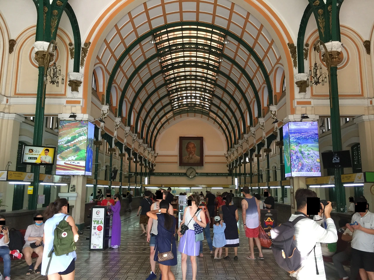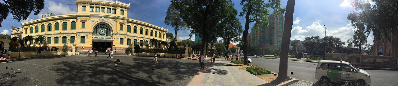 중앙 우체국은 프랑스 식민지 시대에 지어졌으며, 아치형의 높은 천장과 입구 정면의 호찌민의 사진이 인상적이다. 여행자들이 우체국 내부에 마련된 엽서 판매부수에서 엽서를 구입하고 내용을 작성하여 자기 집으로 엽서를 보내는 모습을 볼 수 있다.