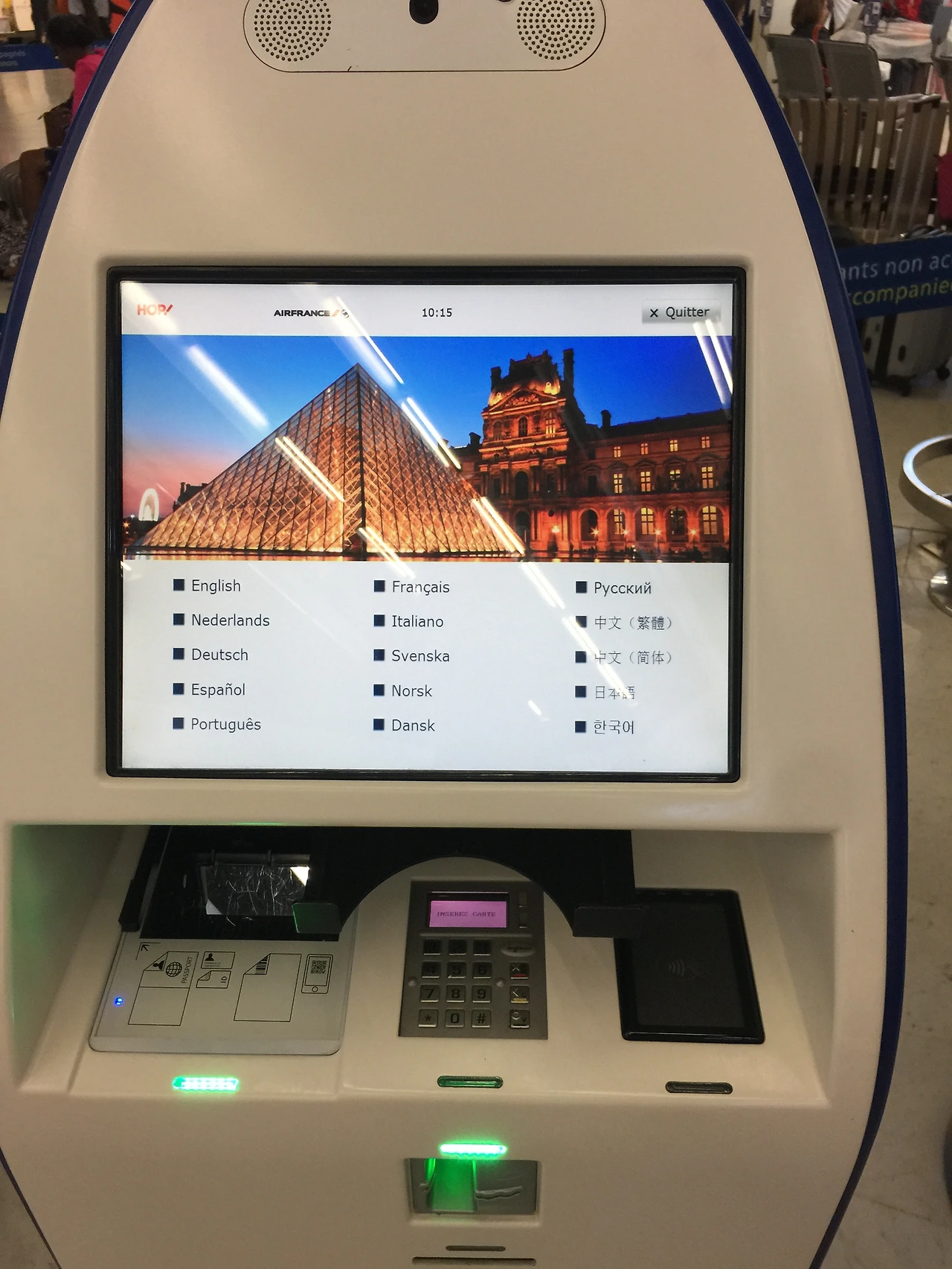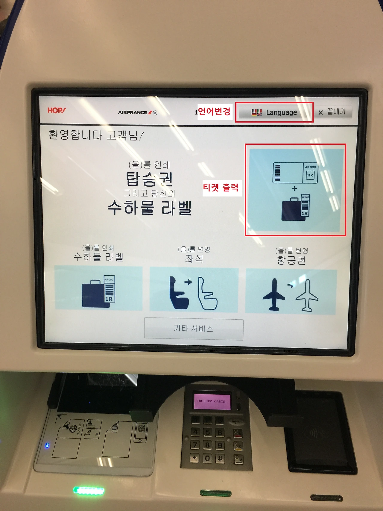 오를리 공항에서 에어프랑스 항공의 경우, 직접 수화물을 부쳐야 되는데, 안내하는 기계가 다행히 한글을 지원해서 처음 짐을 부치는 것임에도 불구하고 수월하게 진행할 수 있었다. 일단 공항에 도착해서 티켓팅을 하였다. 티켓팅 역시 기계로 진행하였다(한국어 지원/ 만세!)