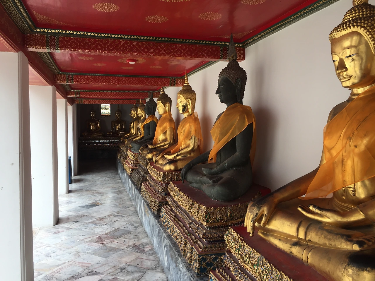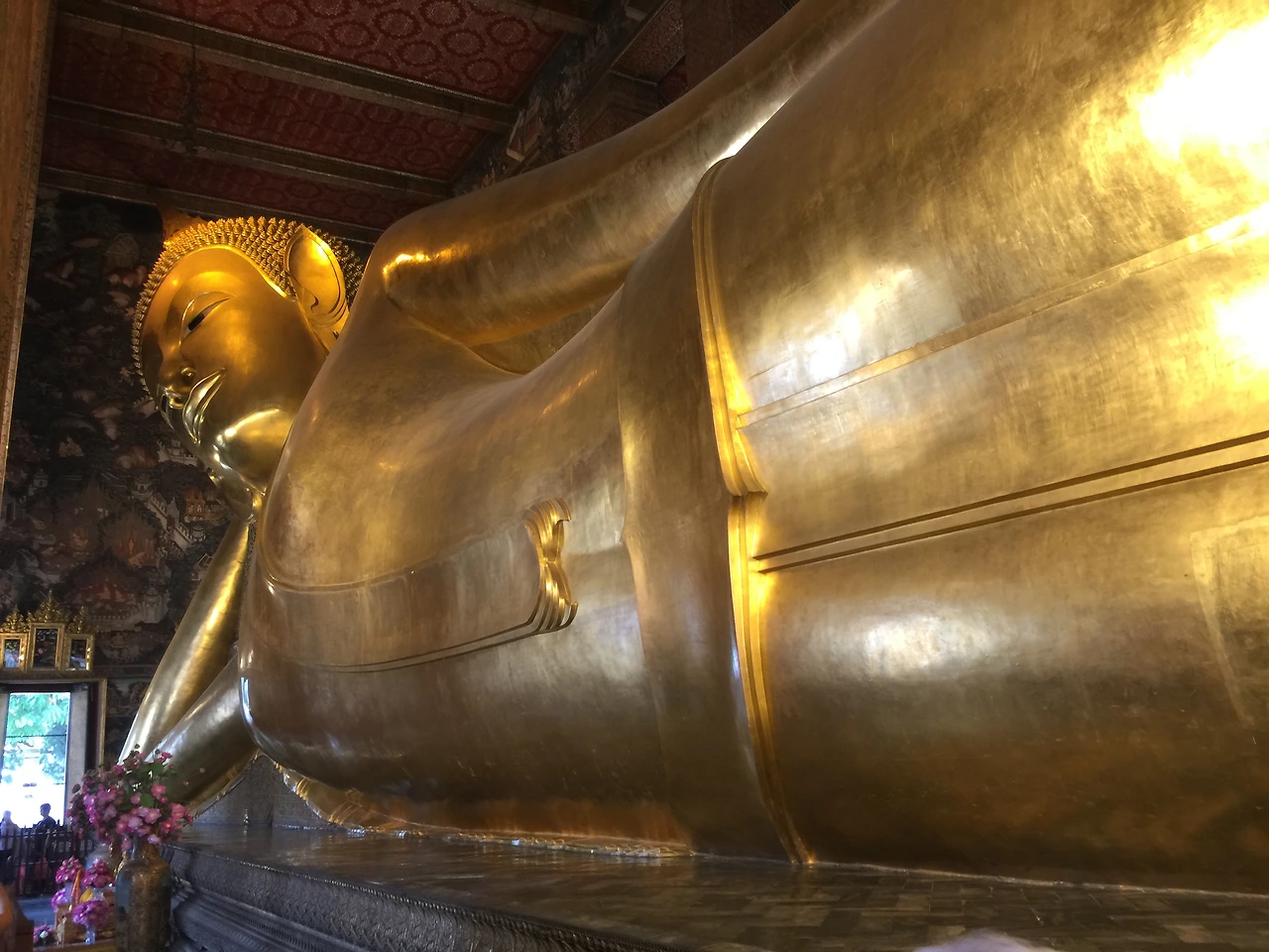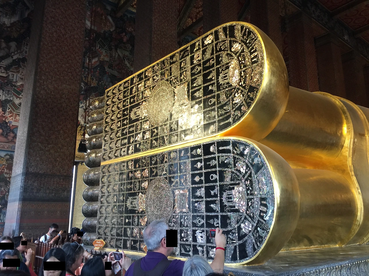 왕궁 관람을 마치고 와포로 향했다. 와포는 아유타야 양식으로 지어진 가장 오래된 사원으로 타이 마사지 교육도 이루어지고 있다. 와포 사원중 와불상이 가장 유명한데 너무 커서 전체 모습을 한 번에 불상을 보기 어렵다. 특히 발바닥에는 자개로 108 번뇌를 묘사한 그림이 그려져 있다.