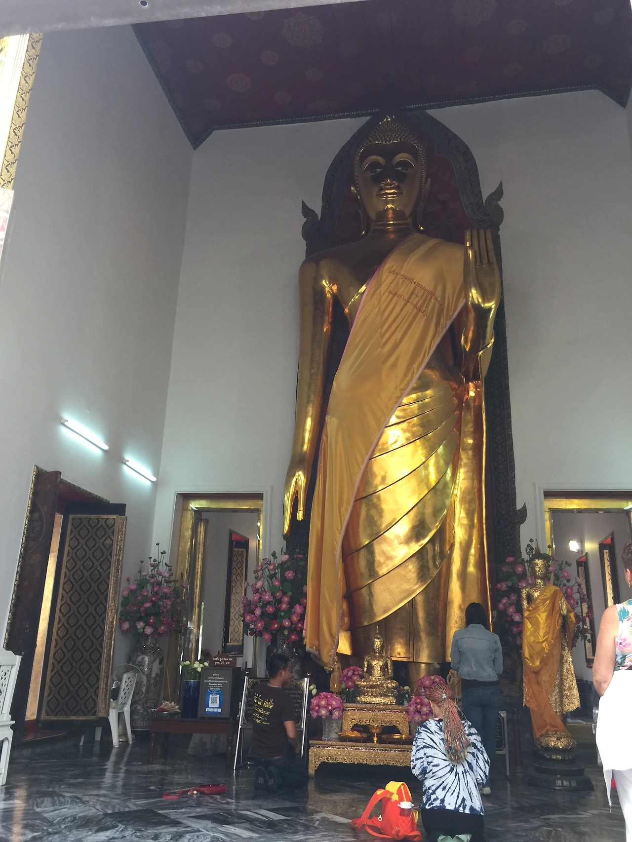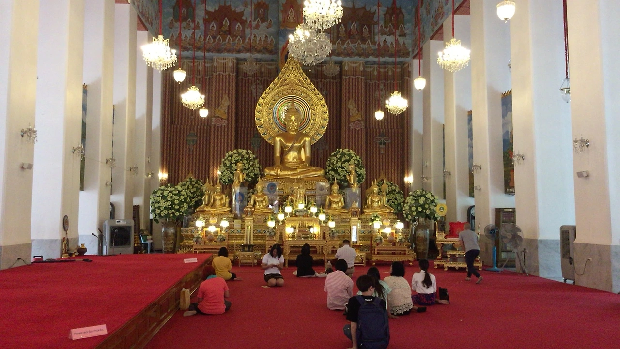 이제 카오산 로드 쪽으로 이동하면서 방람푸 시장 근처 사원에 방문하기로 하였다. 왓 차나쏭크람 사원은 독특한 불상(얼굴이 서양인 같은 느낌)이 인상적인 사원으로 많은 사람들이 기도를 올리고 있었다.