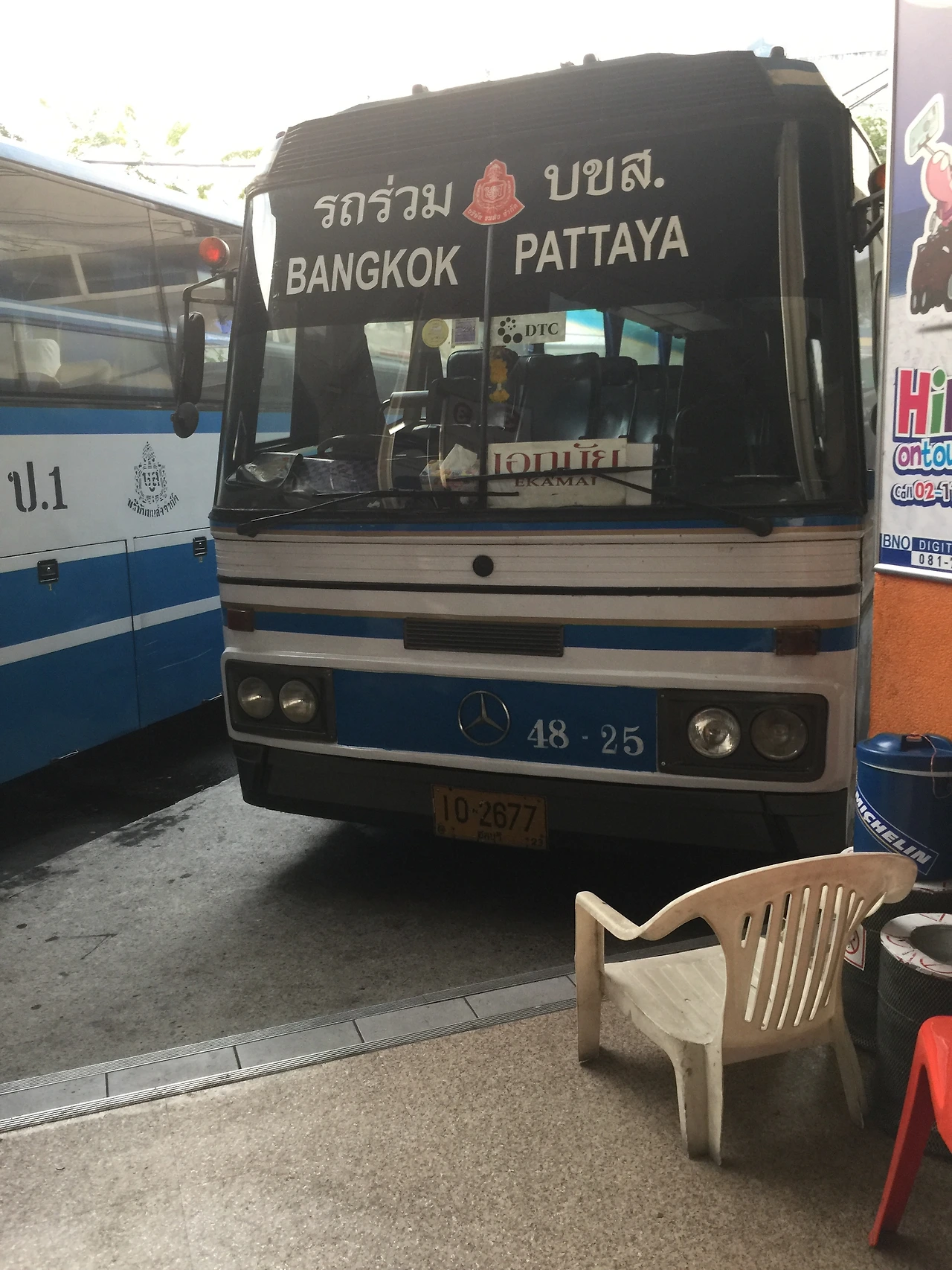 방콕에서 파타야까지 가는 방법은 에까마이 터미널(BTS를 타고 에까마이 역에서 내림)에서 출발하는 방법이 있는데, 넉넉잡고 3시간 정도 걸린 듯하다. 오랫동안 이동하므로 화장실을 미리 다녀오는 것이 좋고 특이한 것은 버스 내 화장실이 있다.