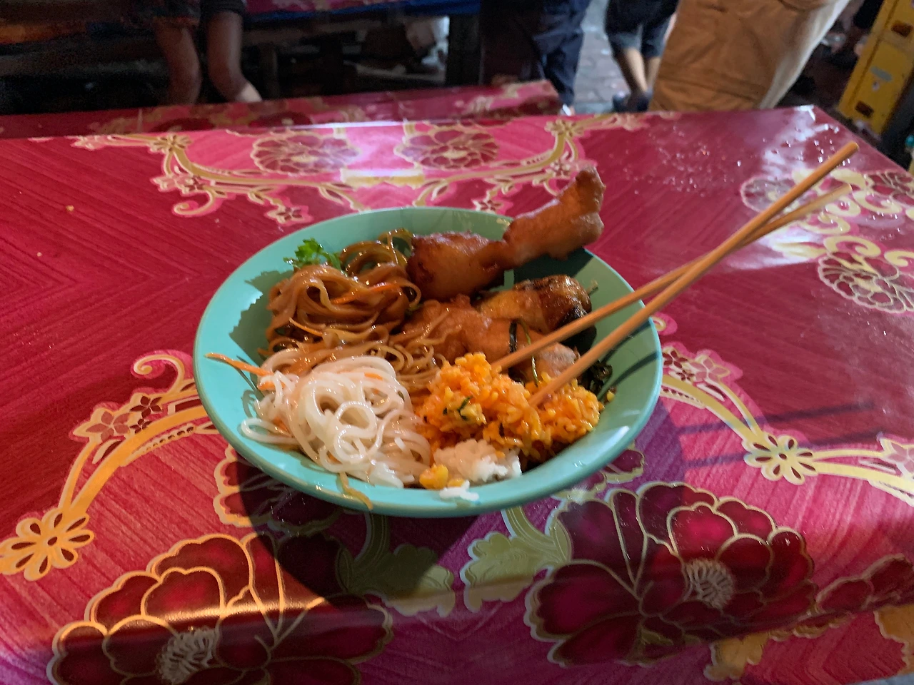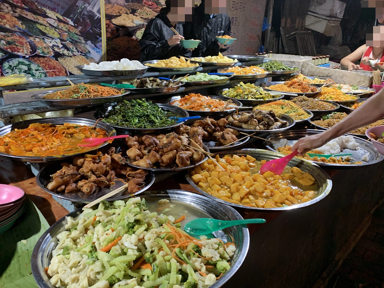 야시장을 대충 둘러본 후, 저녁을 먹기 위해 골목 시장으로 들어갔다. 골목 한쪽으로 노천 식당이 즐비하였고 많은 사람들이 모여 있었다. 지저분한 느낌이지만 음식들은 먹을만해 보였다. 골목 중간쯤 뷔페식 식당에 자리를 잡고 앉았다. 그릇 하나에 밥과 반찬을 원하는 대로 담을 수 있는 방식이다.