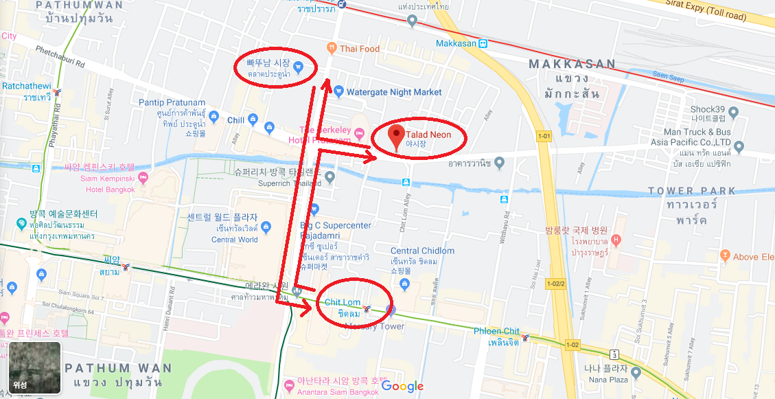 호텔에서 체크인 후, 짐을 정리하고 잠깐의 휴식을 취했다. 그리고 예전에 가보지 못했던 딸랏 네온 야시장으로 향했다. 야시장의 위치가 BTS 역에서 보았을 때, 많이 걸어야 하는 위치에 있었다. 오늘은 왠지 걷기 기록을 세울 수 있을 것 같다는 불길한 예감이 들었다.