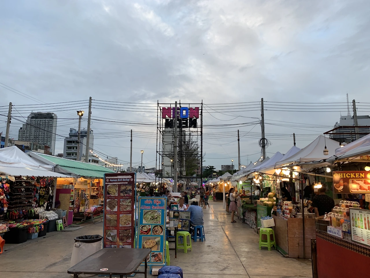 운하를 건너 오른쪽으로 20분쯤 걸어가자 야시장이 보였다. 아직 초저녁이라 그런지 사람들이 별로 없었다. 야시장의 규모는 그리 크지 않고 시장 중간에 'NEON'이란 글자가 밝게 켜져 있었다. 주로 식당이 위주로 영업이 이루어졌지만 옷이나 기념품 등도 팔고 있었다. 일부러 찾아올 만큼 특별한 야시장은 아닌 것 같다. 방콕에는 이 정도 규모의 야시장이 많다.