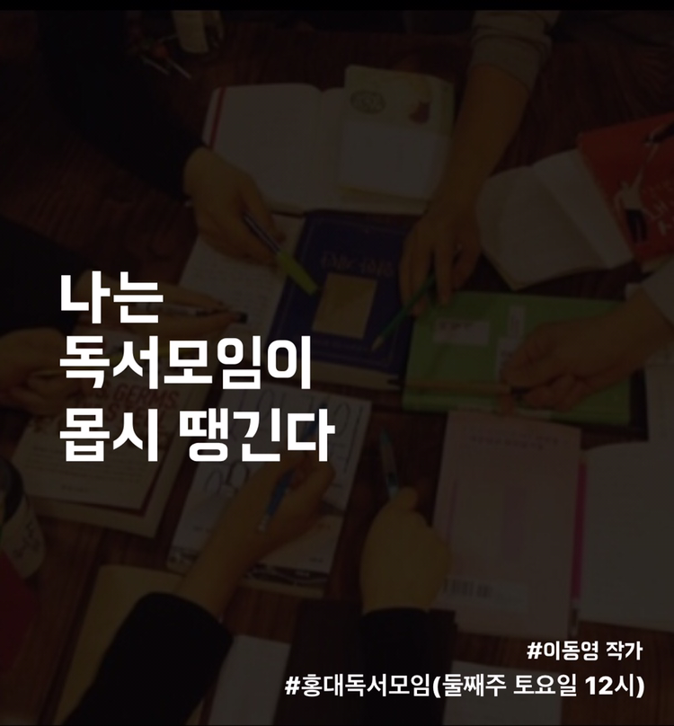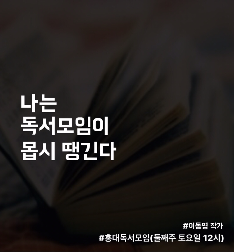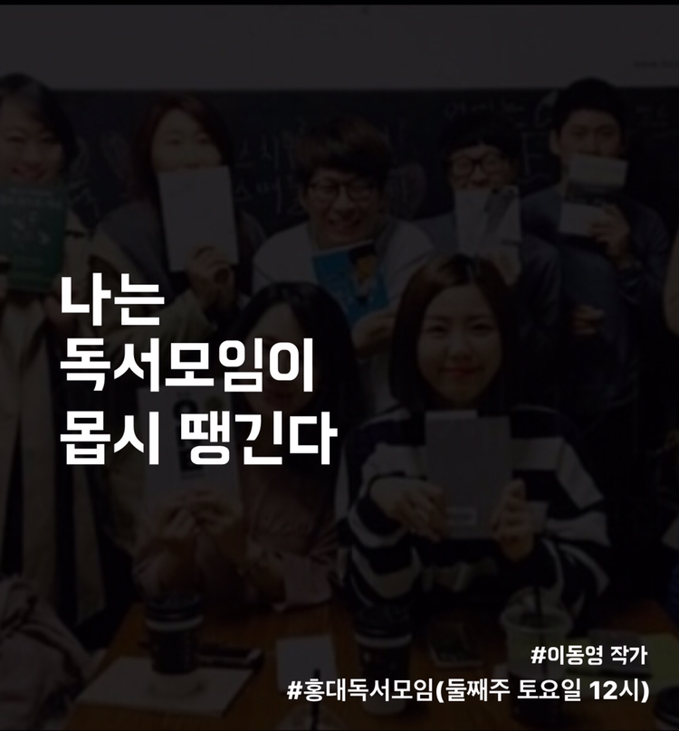 이동영 작가와 함께 하는 홍대독서모임에 많은 관심과 참여 바랍니다. 정기모임으로 매월 둘째주 토요일 정오(점심 12시)예정입니다. 참고로 선착순이라 망설이면 늦어요~!!
