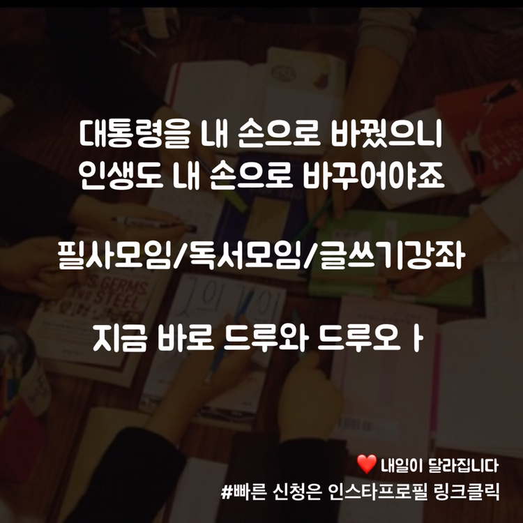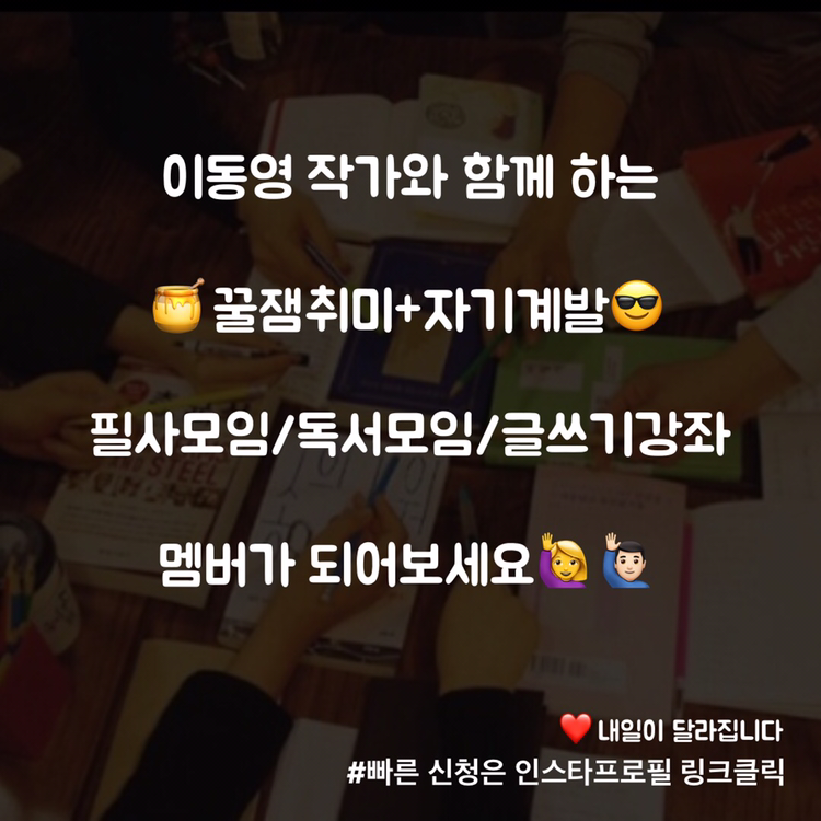 이동영 작가 모임&강좌 공지(5~6월) 2017년 5월~6월 공지입니다. 독서모임, 필사모임, 글쓰기 강좌 등 | 1) 홍대 필사모임 한 줄 소개 각자 읽을 책을 가져와서 조용히 읽고 마음에 닿은 책 속의 문장을 베껴쓴 후(약 45분) 함께 이야기 나누는(약 45분) 필사모임입니다. 장소 홍대입구역 1번 출구 방면 홍대 <팀플레이스> 스터디카페 일정 5월~6월 셋째주/넷째주 목요일 (5/18, 5/25, 6/15, 6/22) 저녁 7시 30분 ~(총 90분 내외)