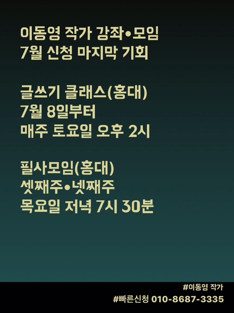글쓰기 클래스 4기 <글쓰기 시작반> 선착순 신청(7월 토요일) 신청서 작성이 번거롭다면? 빠른 문자신청 : 010-8687-3335 이동영 작가에게 7월 <글쓰기 시작반> 신청하고 싶어요~ 하고 남겨주세요^^ 이동영 작가와 함께 하는 2017년 7월 글쓰기 클래스 4기 <글쓰기 시작반> 선착순 신청란입니다. (강좌일정: 7월 8일 15일 22일 29일(총 4회) 커리큘럼 1주차: 습관화(동기부여) 2주차: 재능보다 재료 3주차: 발견메모/대입하기 4주차: 필사모임 및 총정리 특강 신청 시 개인정보(이름, 연락처, 계좌번호)활용에 동의함을 의미합니다. 오직 글쓰기 클래스 소식 알림(공지) 및 환급, 본인확인용도로만 쓰이며 원치 않으시는 경우 말씀해주시면 2일 이내 파기합니다.참가비는 첫 수업 직전일까지만 100% 환불 신청가능. 공간 대관 시 인당(사람수) 한 달 예약을 하기 때문에, 수업이 시작되면 100% 환불이 어렵습니다. ------------------------------------- 장소: 홍대입구역 1번 출구 방면 <팀플레이스>(예정) 참가비: 13만원(단, 6월 25일까지(얼리버드 기간혜택) 신청 시 10만원 아래 항목을 작성해 제출하시고 입금하시는 선착순으로 클래스 참여 등록이 확정됩니다. 참가비 입금계좌: IBK 기업은행 01086873335(예금주: 이동영) 선착순은 입금순입니다.