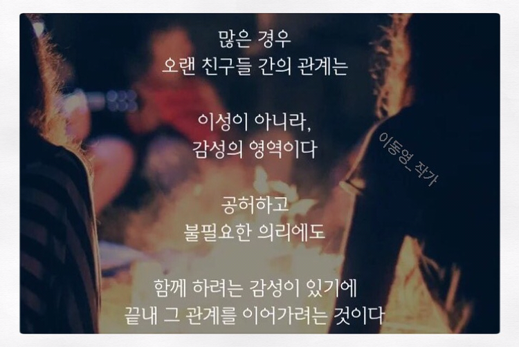 많은 경우 친구들 간의 오랜 관계가 가능한 이유는 이성이 아니라, 감성이 공존하기 때문이라 생각합니다. 지금 그 친구와의 관계를 떠올려 보세요. 공허하고 불필요한 의리만이 남아있어도 서로 함께 하려는 감성이 있기에 끝내 그 관계를 이어가려는 것은 아닌지요.