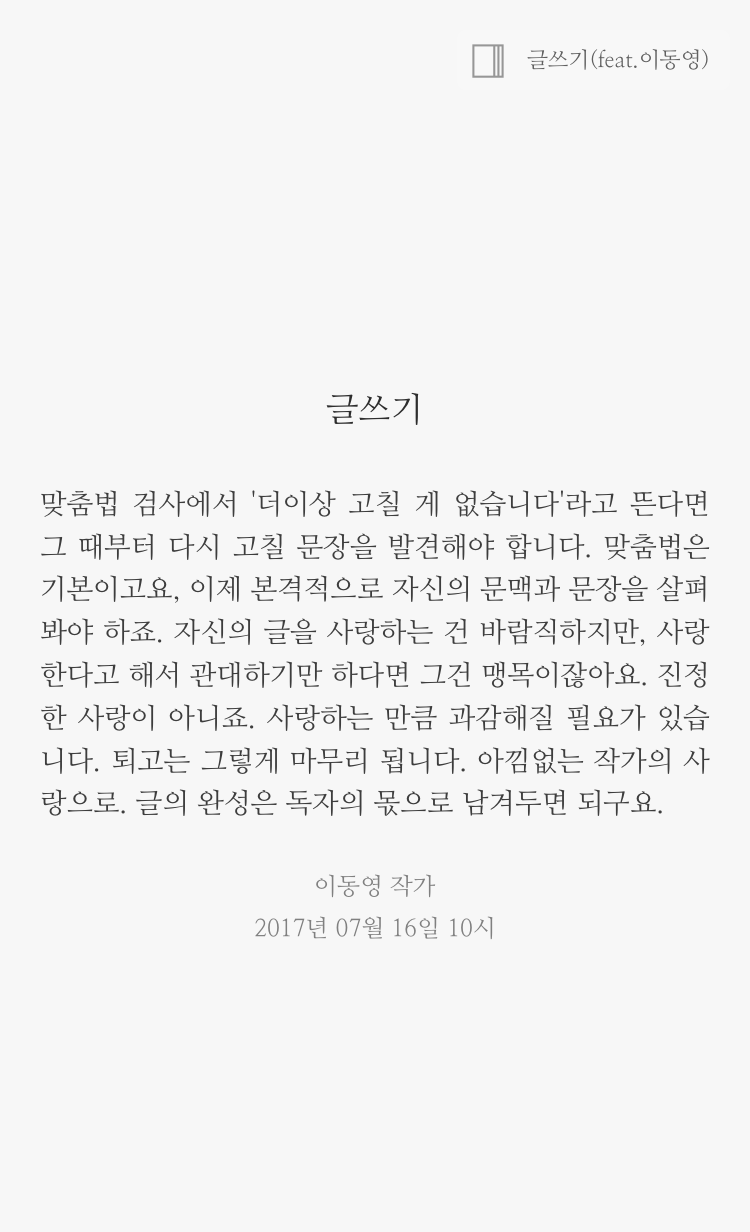 글쓰기 클래스 제 5기 선착순 신청(9일부터 매주 토요일) 신청서 작성이 번거롭다면? 빠른 문자신청 : 010-8687-3335 이동영 작가에게 9월 <글쓰기 클래스> 신청하고 싶어요~ 하고 남겨주세요^^ 이동영 작가와 함께 하는 2017년 9월 글쓰기 클래스 5기 선착순 신청란입니다. 수강인원은 최대 7명입니다(소수정예) (강좌일정: 9월 9일, 16일, 23일, 30일(총 4회) 오후 2시부터 90분 내외) 커리큘럼(★변경 가능) 1주차: 습관화(동기부여) 2주차: 재능보다 재료 3주차: 발견, 메모, 대입하기 4주차: 필사모임 및 총정리 특강 신청 시 개인정보(이름, 연락처, 계좌번호)활용에 동의함을 의미합니다. 공간 대관 시 인당(사람수) 한 달 예약을 하기 때문에, 수업이 시작되면 100% 환불이 어렵습니다. ------------------------------------- 장소: 연남동 소셜팩토리 홍대2호점 참가비: 13만원(얼리버드 조기등록 혜택 8월 25일까지 한 하며, 이후 15만원 오를 수 있음) 아래 항목을 작성해 제출하시고 입금하시는 선착순으로 클래스 참여 등록이 확정됩니다. 참가비 입금계좌: IBK 기업은행 01086873335(예금주: 이동영) 선착순은 입금순입니다.