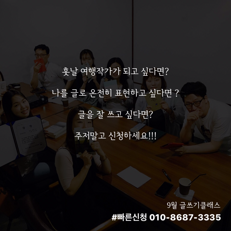 글쓰기 클래스 제 5기 선착순 신청(9일부터 매주 토요일) 신청서 작성이 번거롭다면? 빠른 문자신청 : 010-8687-3335 이동영 작가에게 9월 <글쓰기 클래스> 신청하고 싶어요~ 하고 남겨주세요^^ 이동영 작가와 함께 하는 2017년 9월 글쓰기 클래스 5기 선착순 신청란입니다. 수강인원은 최대 7명입니다(소수정예) (강좌일정: 9월 9일, 16일, 23일, 30일(총 4회) 오후 2시부터 90분 내외) 커리큘럼(★변경 가능) 1주차: 습관화(동기부여) 2주차: 재능보다 재료 3주차: 발견, 메모, 대입하기 4주차: 필사모임 및 총정리 특강 신청 시 개인정보(이름, 연락처, 계좌번호)활용에 동의함을 의미합니다. 공간 대관 시 인당(사람수) 한 달 예약을 하기 때문에, 수업이 시작되면 100% 환불이 어렵습니다. ------------------------------------- 장소: 연남동 소셜팩토리 홍대2호점 참가비: 13만원(얼리버드 조기등록 혜택 8월 25일까지 한 하며, 이후 15만원 오를 수 있음) 아래 항목을 작성해 제출하시고 입금하시는 선착순으로 클래스 참여 등록이 확정됩니다. 참가비 입금계좌: IBK 기업은행 01086873335(예금주: 이동영) 선착순은 입금순입니다.