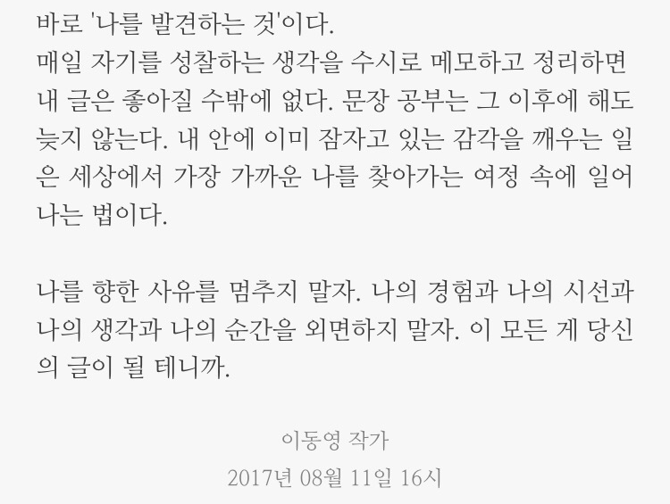 나를 향한 사유를 멈추지 말자. 나의 경험과 나의 시선과 나의 생각과 나의 순간을 외면하지 말자. 이 모든 게 당신의 글이 될 테니까.