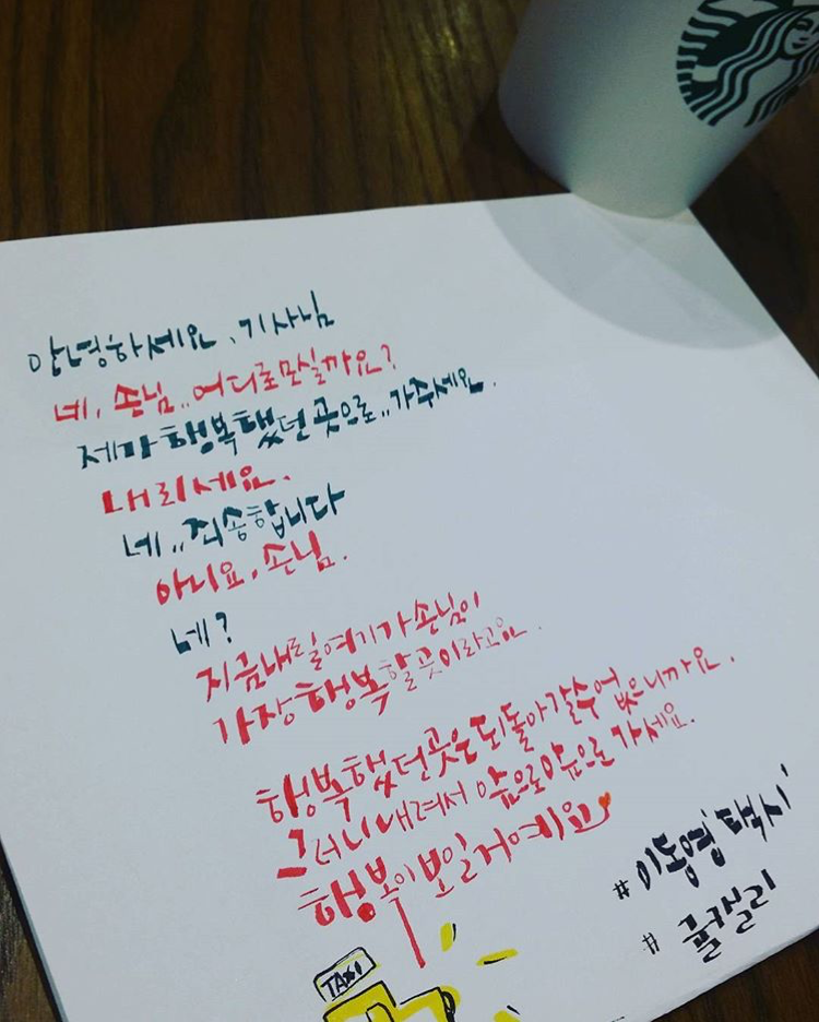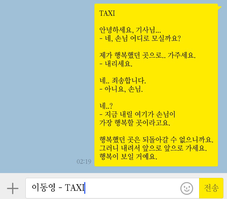 TAXI안녕하세요, 기사님...- 네, 손님 어디로 모실까요?제가 행복했던 곳으로.. 가주세요.- 내리세요.네.. 죄송합니다. - 아니요, 손님.네..?- 지금 내릴 여기가 손님이가장 행복할 곳이라고요.행복했던 곳은 되돌아갈 수 없으니까요.그러니 내려서 앞으로 앞으로 가세요.행복이 보일 거예요.