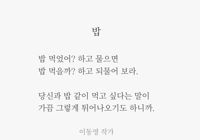 밥 먹었어? 하고 물으면밥 먹을까? 하고 되물어 보라.당신과 밥 같이 먹고 싶다는 말이가끔 그렇게 튀어나오기도 하니까.