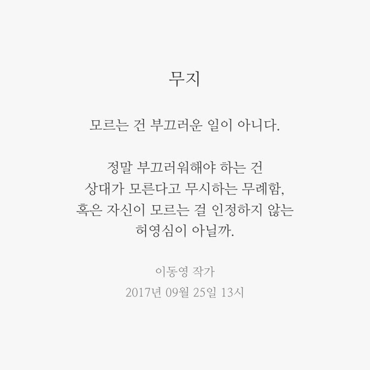 모르는 건 부끄러운 일이 아니다.정말 부끄러워해야 하는 건상대가 모른다고 무시하는 무례함,혹은 자신이 모르는 걸 인정하지 않는허영심이 아닐까.