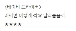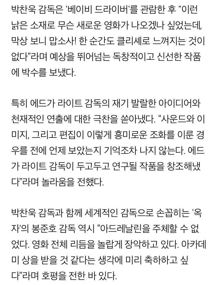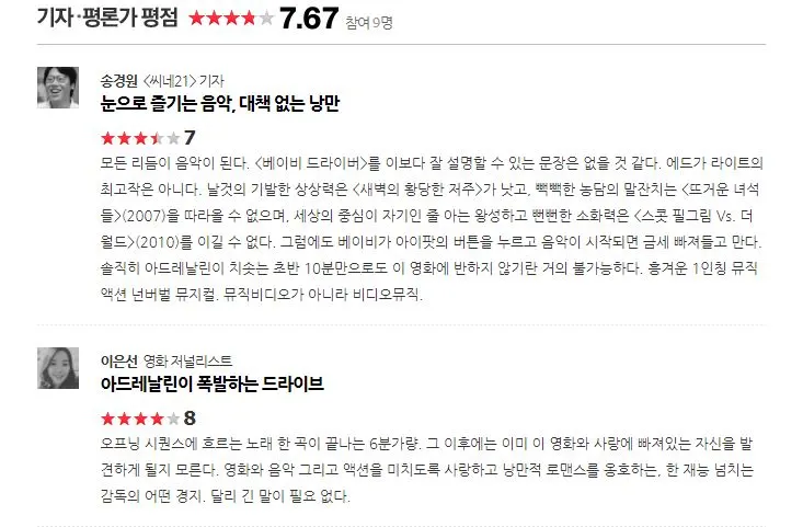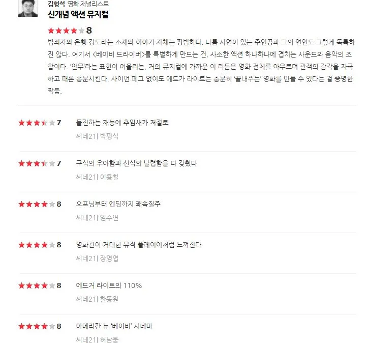 영화에 대한 신뢰도가 확 올라갔다. 보통 평론가도 그렇지만 이동진 평론가가 평점을 후하게 주는 편은 아니라서 그렇다. 이 말을 곱씹으며 영화를 보았다. 다 보고 나니 "영심이~ 짝짝 맞아"하는 친척동생과의 손뼉 치기 가위바위보 게임이 떠올랐다. 음악과 동작, 장면의 전환이 평론가의 말대로 아주 '짝짝 달라붙어' 딱딱 맞아떨어졌다. 스토리가 신선 했다기보다는 캐릭터가 분명했다. '캐릭터가 하는 짓'에 일관성이 있었다. 정말 저 캐릭터라면 저렇게 살 것 같았다. 'B-A-B-Y 베이비!'하는 청년은 마지막 장면까지 나를 실망시키지 않았다. 사람도 죽이고 강도짓도 공범인데 예쁜 여자친구 만나 행복하게 잘 먹고 잘 살면 너무 주인공 PASS-라고 생각했는데, 역시 마무리가 확실한 감독에게 안도의 웃음을 지었다. 방금, 이 글을 쓰기 전에 다른 영화평론을 보았다.