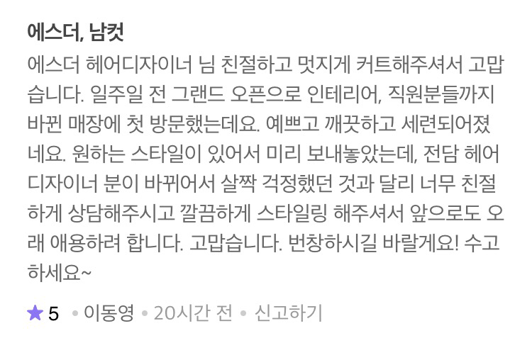 "(그랜드 오픈 이후) 제가 앞으로 예쁘게 하고 싶으신 스타일로 잘 해드릴게요~ 이제 사진 안 가져오셔도 되게끔 다 메모해둘 테니까요. 앞으로 (사진은) 안 챙겨 오셔도 되세요^^ 카카오 헤어로 예약결제하셔서 그냥 가시면 되고요~ 수고하셨습니다. 오늘, 멋지시네요~"