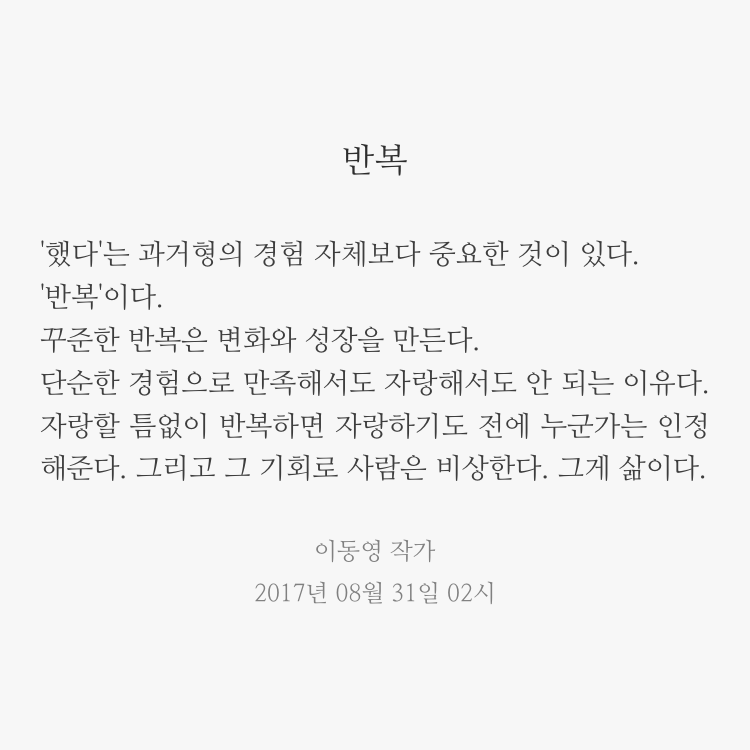 단순한 경험으로 만족해서도 자랑해서도 안 되는 이유다. 자랑할 틈없이 반복하면 자랑하기도 전에 누군가는 인정해준다. 그리고 그 기회로 사람은 비상한다. 그게 삶이다.