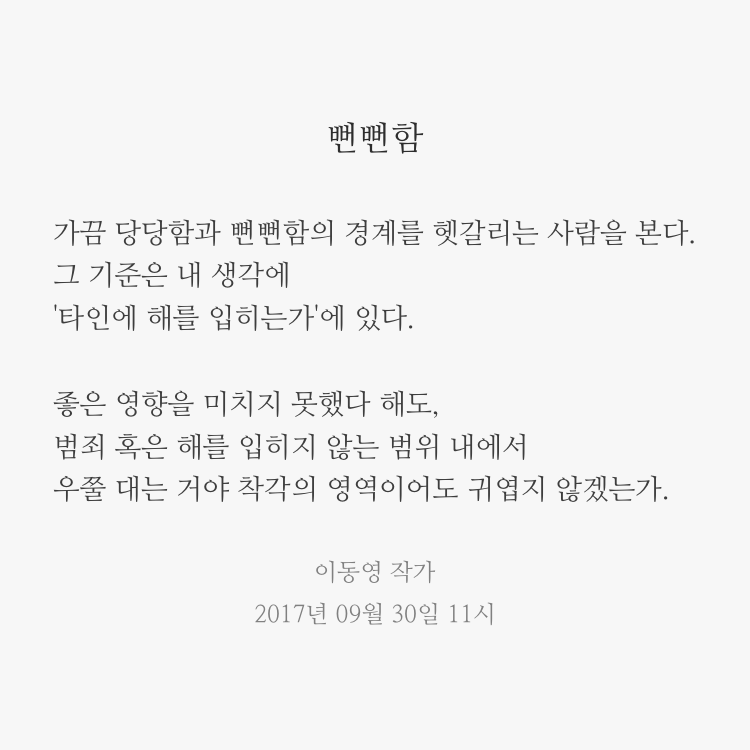 가끔 당당함과 뻔뻔함의 경계를 헷갈리는 사람을 본다. 그 기준은 내 생각에 '타인에게 해를 입히는가'에 있다.