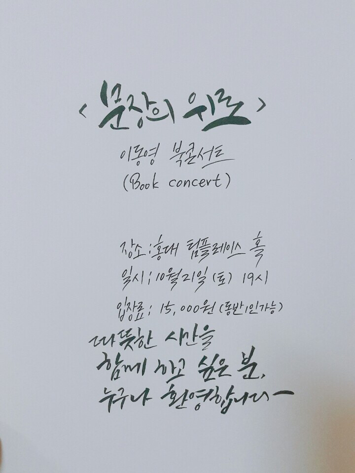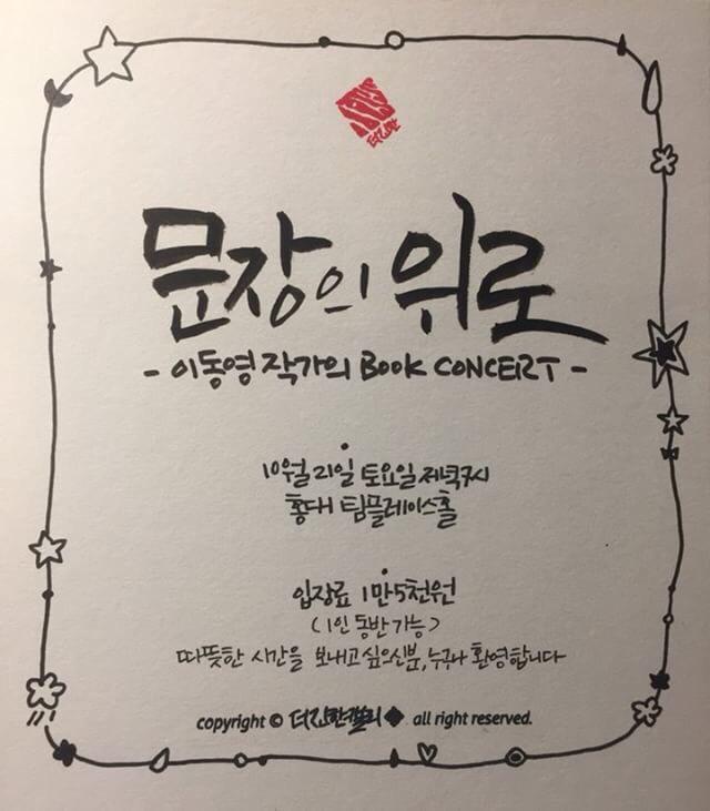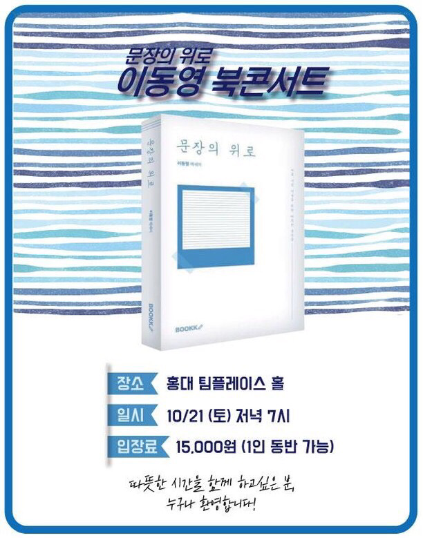 이동영 에세이 출간 기념<문장의 위로> 북콘서트가 10/21(토) 홍대 팀플레이스 홀에서 저녁 7시부터 진행됩니다. 지금 바로 참여 바랍니다 :) 사연 당첨 경품은 기프티콘, 책(저자 사인본), 특강 무료 수강권, 깜짝 선물 등입니다.