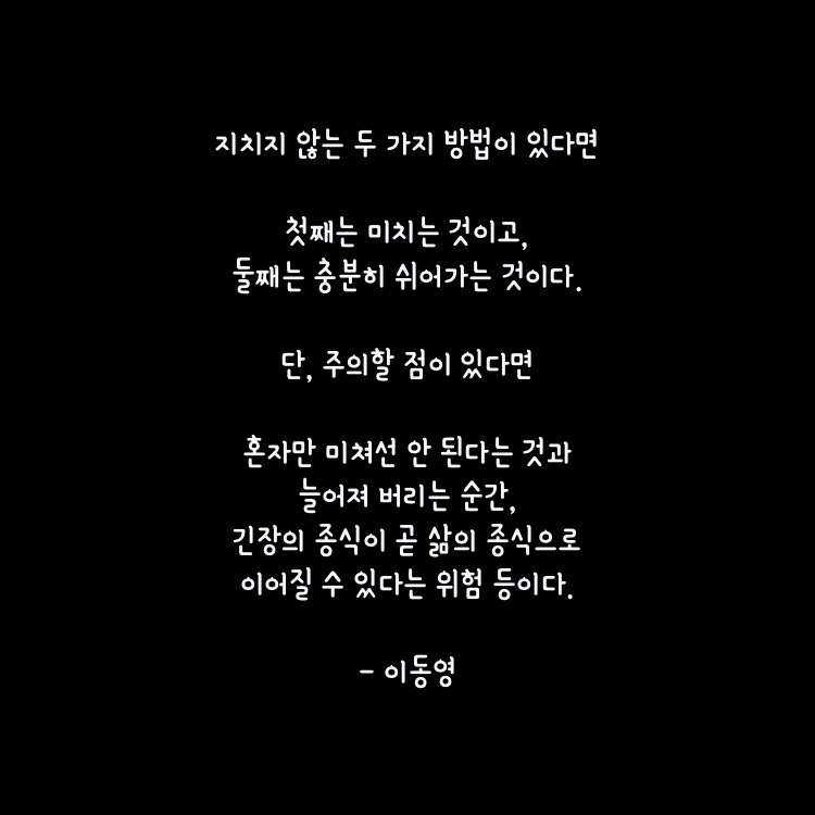 지치지 않는 두 가지 방법이 있다면 첫째는 미치는 것이고, 둘째는 (페이스 조절을 하며)충분히 쉬어가는 것이다. 단, 주의할 점이 있다면혼자만 미쳐선 안 된다는 것과늘어져 버리는 순간,긴장의 종식이 곧 삶의 종식으로 이어질 수 있다는 위험 등이다. - 이동영