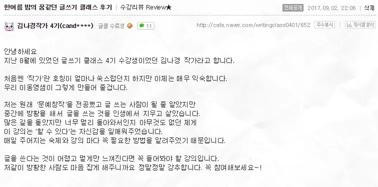 실제 <글쓰기 클래스> <글쓰기 일일특강>등 200분의 수강생을 만나면서 감동했던 점은 포항, 울산 등은 물론 경기권에서도 KTX나 버스를 2시간 이상 타고 수강하기 위해 와주신 분들이 많았다는 사실입니다. 개인의 열정뿐 아니라, 수강생의 만족도도 증명한다고 당당히 말할 수 있겠습니다.