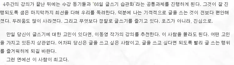 글쓰기 강좌라고 다 같은 글쓰기 강좌가 아니다. 이 글은 필자(이동영 작가)가 하는 글쓰기 강좌에 국한되는 자체 '추천사'이다. 물론 세상에 훌륭한 글쓰기 강좌는 정말 많다. 그래도 글쓰기에 조금이라도 관심이 있는 독자가 이 글을 읽으면 필자와 함께 하고 싶어질 거라 확신한다.
