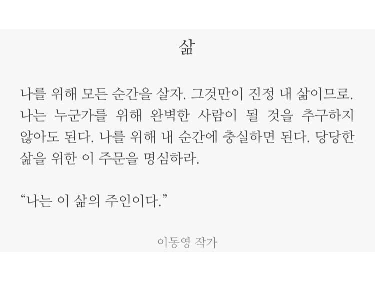 나를 위해 모든 순간을 살자. 그것만이 진정 내 삶이므로. 나는 누군가를 위해 완벽한 사람이 될 것을 추구하지 않아도 된다. 나를 위해 내 순간에 충실하면 된다. 당당한 삶을 위한 이 주문을 명심하라.“나는 이 삶의 주인이다.”