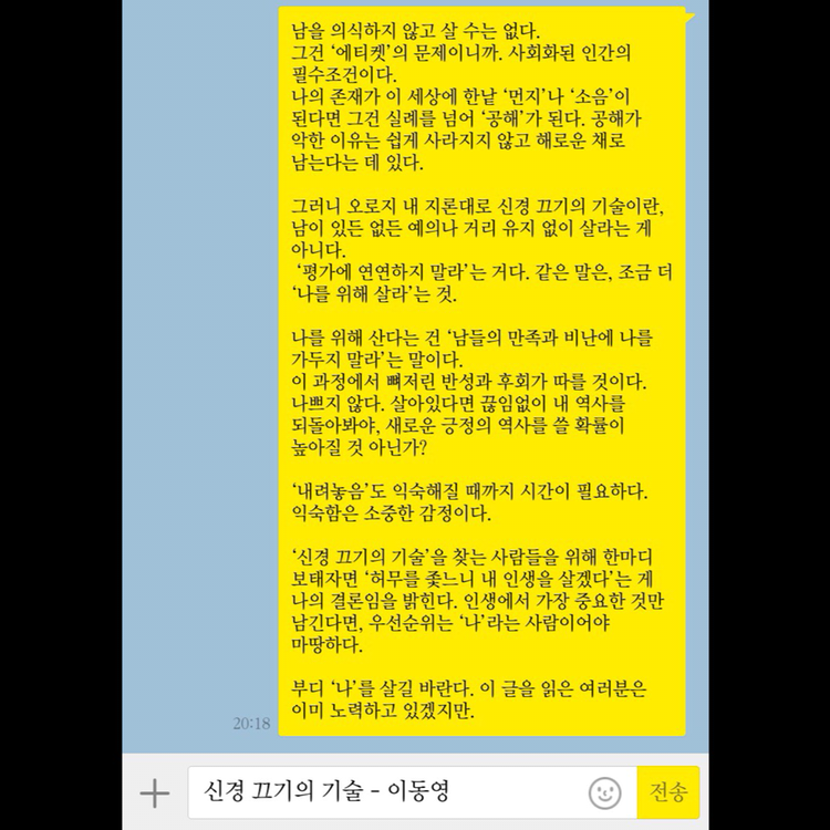 그러니 오로지 내 지론대로 신경 끄기의 기술이란, 남이 있든 없든 예의나 거리 유지 없이 살라는 게 아니다. ‘평가에 연연하지 말라’는 거다. 같은 말은, 조금 더 ‘나를 위해 살라’는 것.