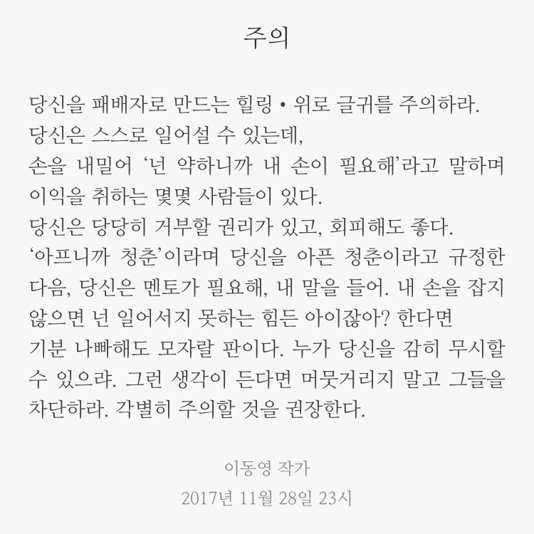 내 책에 ‘강해져야 한다’ 투의 말은 문장의 위로 전체 기조에도 맞지 않아서 개정했다. 기류에 휩쓸려 반짝 나를 속인 것이다. 지금 책을 구입하면 그런 문장들은 없다(있다면 개정 대상). 요즘 소위 ‘SNS시인’이라면서 불안하고 약한 이들을 위로한다는 가짜들이 판을 친다. 그들이 혹 위로를 강제하고 있진 않은지 냉철히 살펴보고 ‘진짜 위로’를 구분해야 한다. 작가라는 타이틀로 스스로 우위를 점하여 우리를 열등한 존재로 놓고서 자신의 이익을 취하는지 여부를 보면 진짜와 가짜를 구분할 수 있다. 적어도 내가 원치 않은 직면을 해야 하는 공감글의 일방적 희생양이 되도록 놔두는 건 유쾌하지 못하니까. 우리를 함부로 규정하여 ‘감히’ 위로하지 못하도록 해야 한다. 그들은 그걸 ‘이용’한다. 흔히 그걸 ‘악용’이라고 부른다.