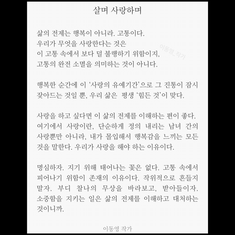 명심하자. 지기 위해 피어나는 꽃은 없다. 고통 속에서 피어나기 위함이 존재의 이유이다. 작위적으로 흔들지 말자. 부디 찰나의 무상을 바라보고, 받아들이자. 소중함을 지키는 일은 삶의 전제를 이해하고 대처하는 것이니까.(이동영)