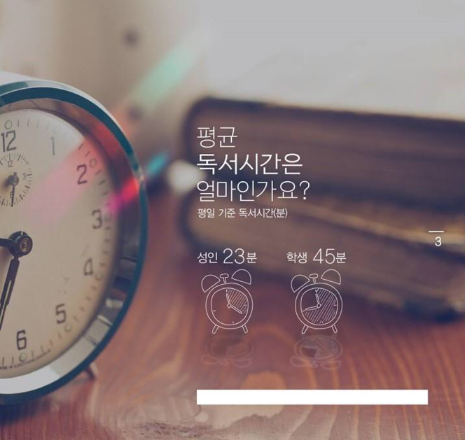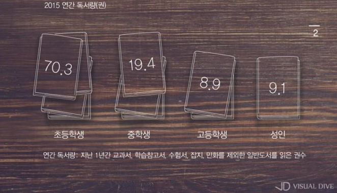 여기에서 퀴-즈 ! 지난 한 해 여러분은 몇 권의 책을 읽으셨나요? 가장 최근 데이터인 2015 국민 독서실태 조사(문화관광부)에 따르면, 성인의 연간 독서량은 평균 9.1권으로 집계되었습니다.