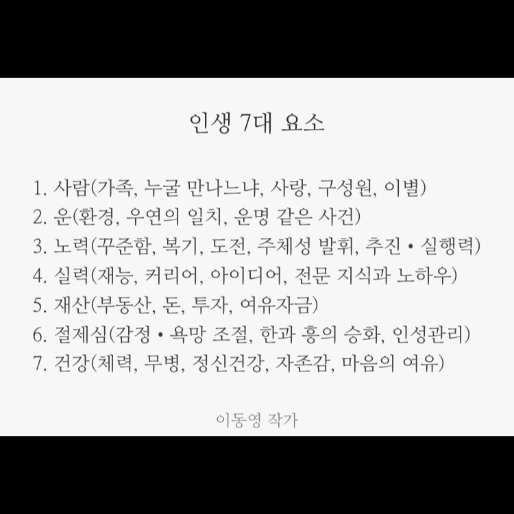 1. 사람2. 운3. 노력4. 실력5. 재산(+생산수단 추가)6. 절제심7. 건강