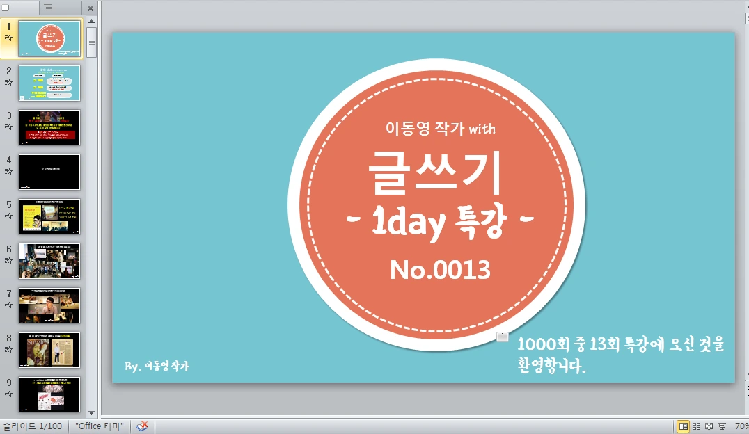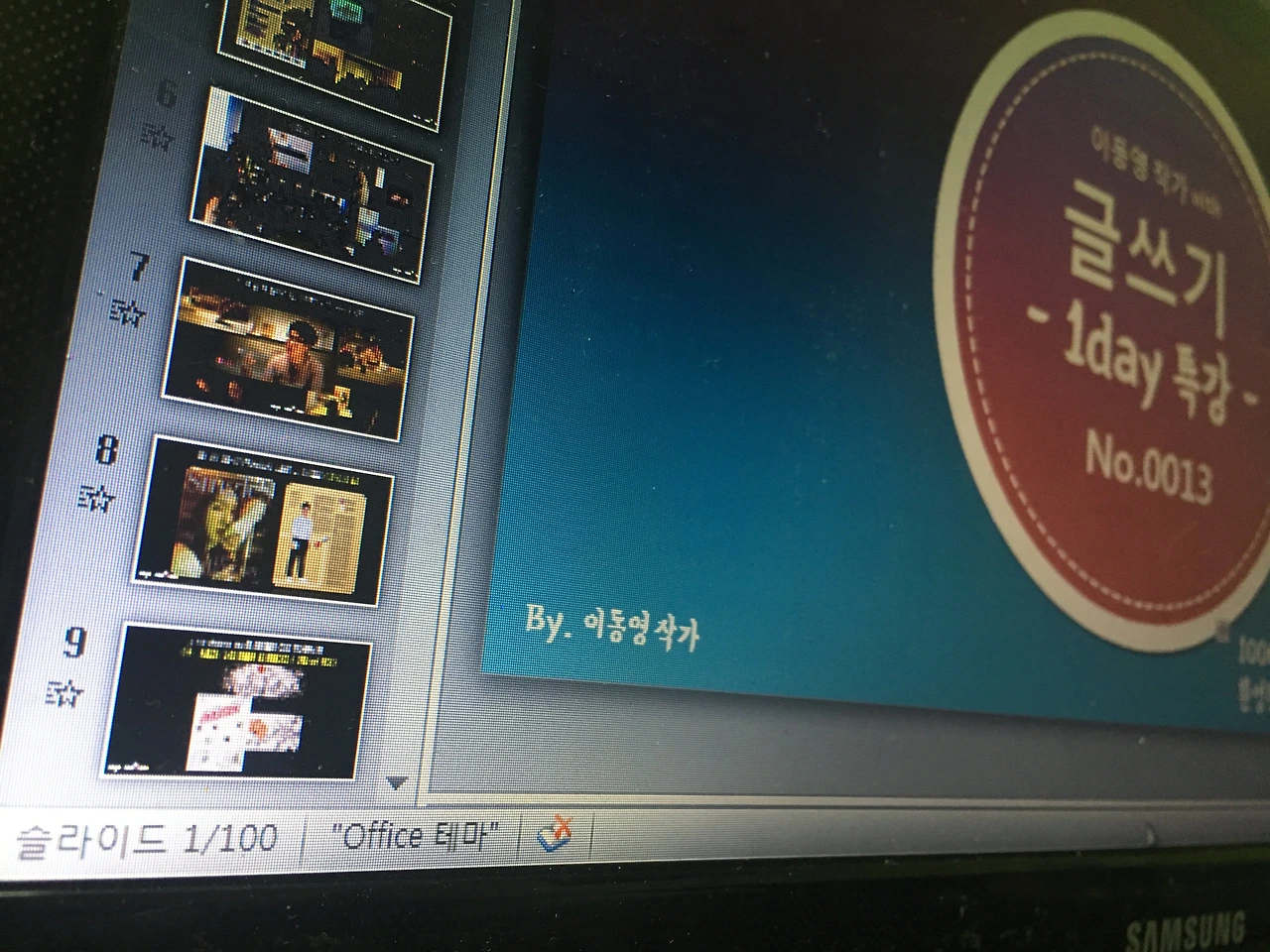 겨우 하루 2시간 남짓한 글쓰기 강의인데, 슬라이드 100을 채웠다. 백개의 슬라이드를 만들겠다가 아니라 하다 보니 그렇게 된 거다. 슬라이드 수가 많다고 해서 좋은 건 아닐 것이다. 어디까지나 강사의 일방적 강의가 아니라, 수강생 밀착형+참여형 강의라 가능한 지점이다.