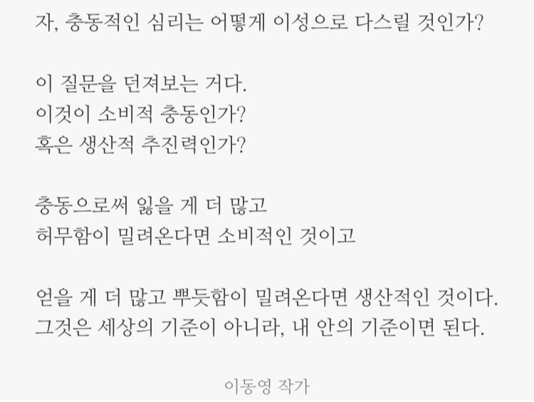 충동으로써 잃을 게 더 많고 허무함이 밀려온다면 소비적인 것이고 얻을 게 더 많고 뿌듯함이 밀려온다면 생산적인 것이다. 그것은 세상의 기준이 아니라, 내 안의 기준이면 된다.